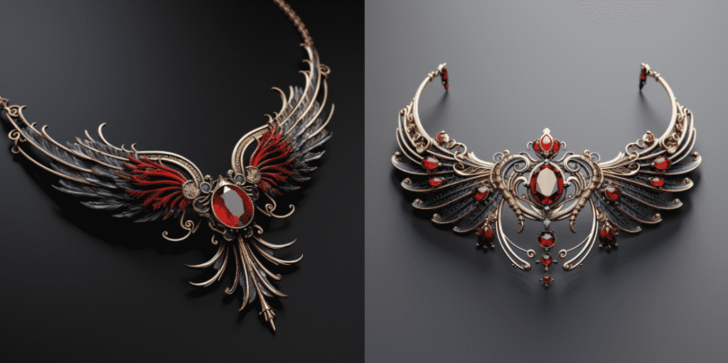 necklace design,Jewelry design, diadem with phoenix bird, Incorporate feathers elements, ruby and obsidian, detailed intricate, photorealistic, product view, –s 150 –v 5.2
