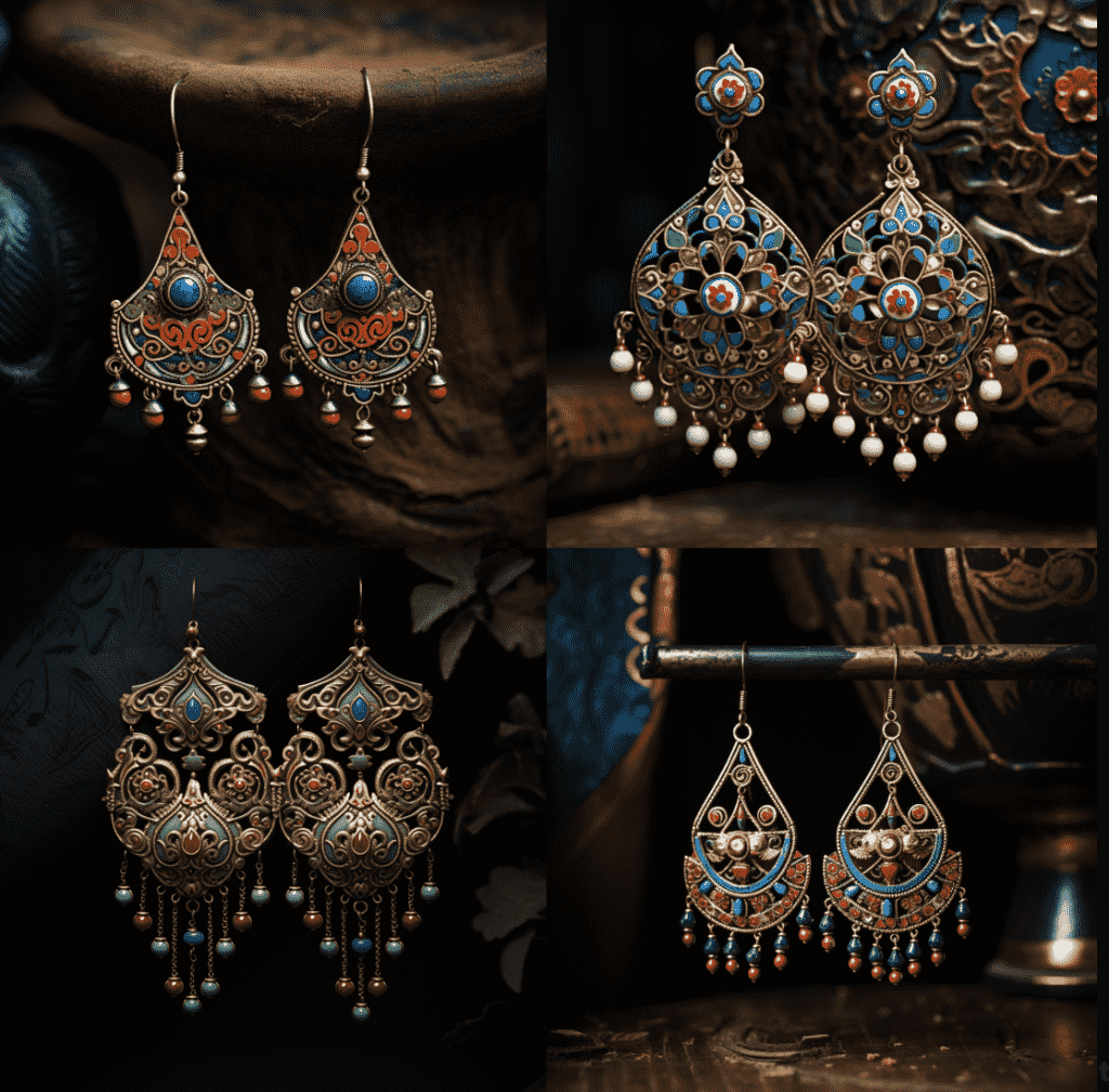 Earring jewelry design,Tibetan style,shot by canon eos RS, Delicate, elegant,detailed intricate,photorealistic,product view,–s 150 –v 5.2