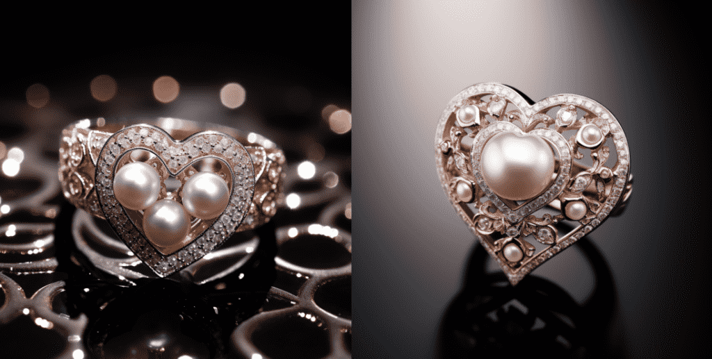jewelry design ,ring design, pearls and diamonds, small heart shape, shot by canon eos R5, Delicate, elegant, detailed intricate,photorealistic, product view,–s 150 –v 5.2