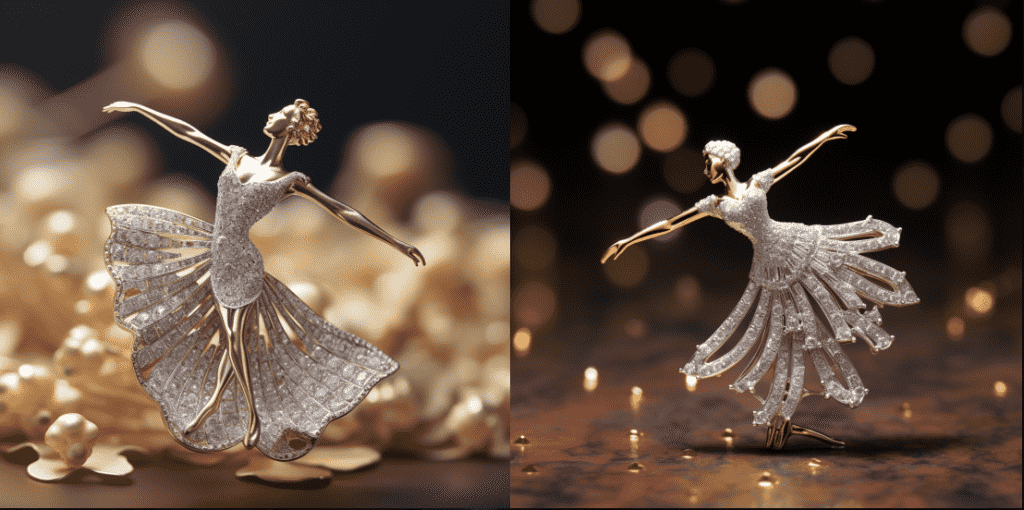 jewelry design,a close up of a brooch ,shape is dance woman in a dress,classic dancer striking a pose, diamonds, shot by canon eos R5, photorealistic, product view,–s 550 –v 5.2