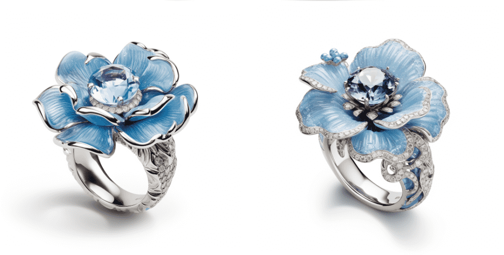jewelry design, Anemone Aqua ring by Sicis,The delicate petals of an Anemone flower are perfectly captured in micro mosaic in this ring, Set with aquamarines, sapphires and diamonds,White gold, Sophisticated,Ornate, Expensive, shot by canon eos R5, photorealistic, product view,–s 550 –v 5.2