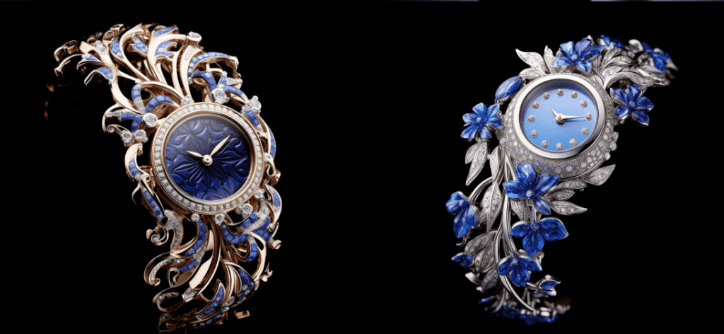 jewelry watches design::1.5, punk-inspired women’s high jewellery watches, Bracelet made of 18-carat white gold adorned with spikes of different heights fully set with 11043 blue brilliant-cut sapphires, Ornate, Expensive, shot by canon eos R5,photorealistic, product view,–s 550 –v 5.2