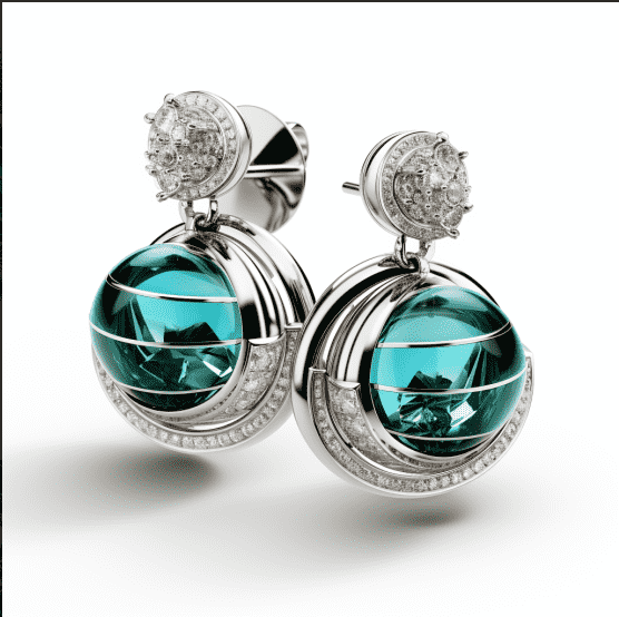 Ultra Modern minimalistic high jewelry design, white background earrings with english lock,in a white gold with central round tourmaline Paraiba Cabochon 10mm surrounded by diamonds or moonstone Cabachon,in a Cosmos idea design, in a van cleef style, spherical motion, Delicate, elegant, detailed intricate, photorealistic, productview –v 5.2 –s 500