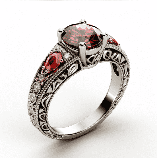 jewelry design, white background, A silver ring with a slim ring band , the ring is set with a big ruby, surrounding the ruby are 12 small 1 carat diamonds, product view,3D render –v 5.2 –s 500