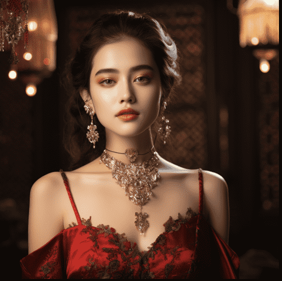 利用MJ,除了可以生成类似于摄影照片的珠宝作品,还可以生成有模特展示效果的图片,当然提示语也需要做相应变化。