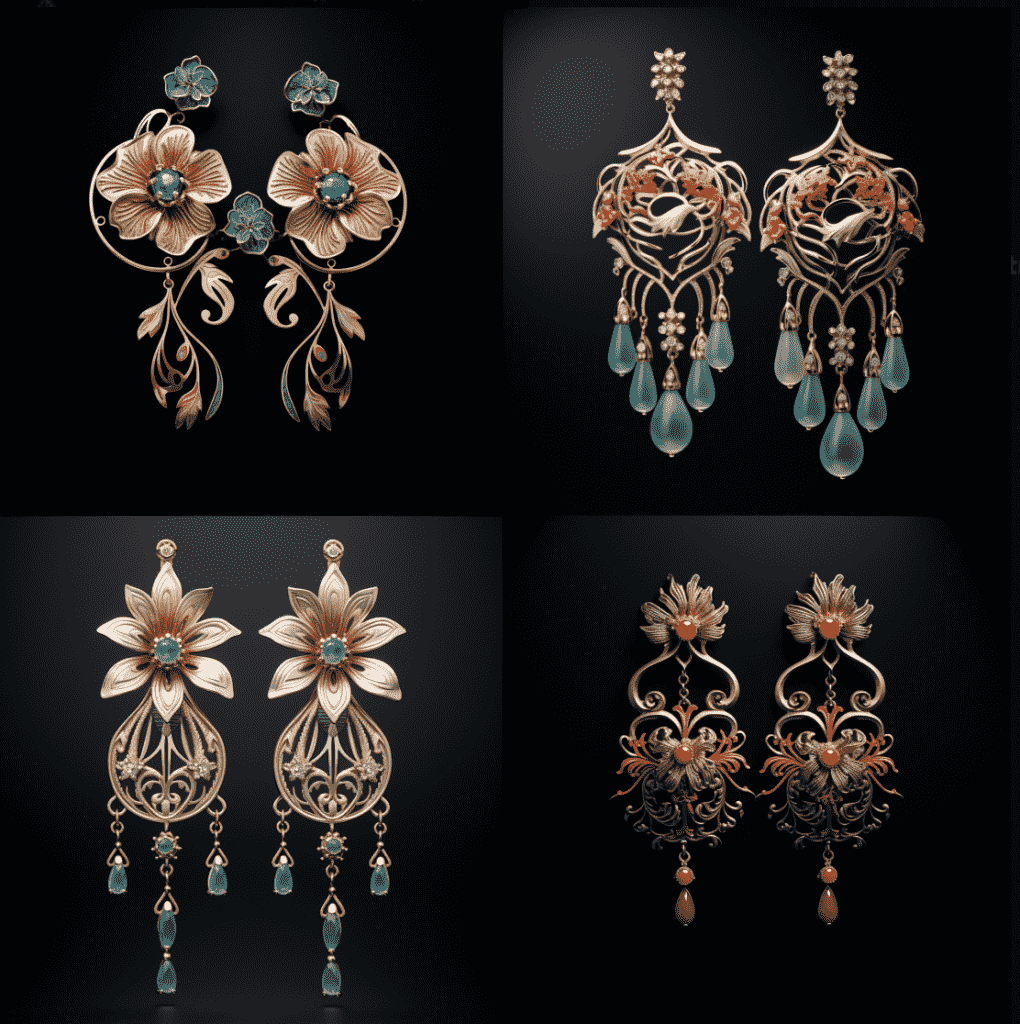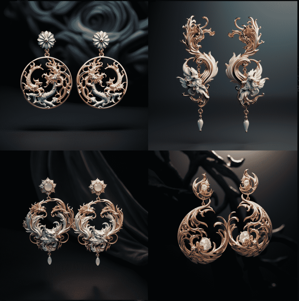 传统的珠宝设计通常需要花费大量的时间和精力进行手绘草图和3D模型制作与渲染,但使用MJ可以快速批量地生成珠宝设计造型创意。