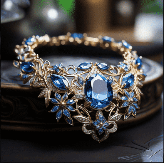 通过查看珠宝的关键词,可以总结出 朋克风格 punk-inspired、蓝宝石 sapphires 等关键词据此可以撰写出提示语: