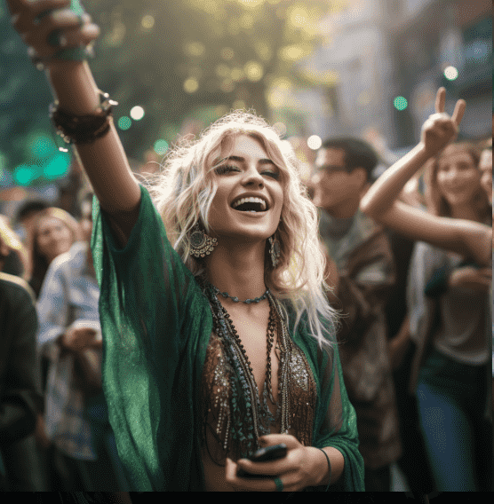一位女子大约 25 岁,穿着绿色波希米亚风格的衣服,拥有轻微卷曲的银发和蓝色大眼睛在街头 跳舞,一只手轻轻抓住空中的旋律,充满了兴奋,周围有很多人举起手机围观。