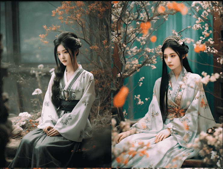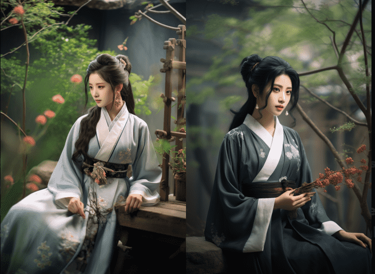 Full portrait, Panoramic view,In a large garden outside a small cabin, there is a 35-year-old beautywith shoulder-length black hair, a calm expression, big eyes, and curved eyelashes. She is wearing a gorgeous HanFu , squatting in the flower bushes holding the flowers. Two butterflies. bokeh, backlighting –ar 2:3 –v 5.2