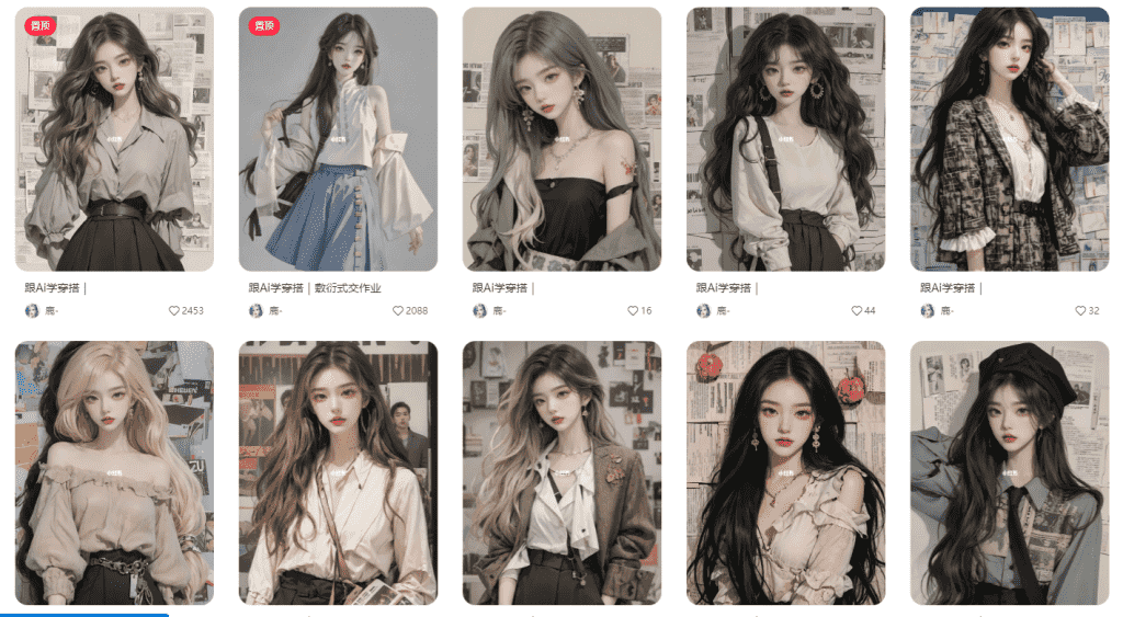 像小红书博主:鹿-,他的作品全都是这种漂亮的小姐姐,穿着不同的衣服搭配,十分养眼,可惜就是博主不分享咒语,不过细细一想,之一类可能只需要套用一个模板,一通百通,所以别人不愿意分享也正常,那咱们就来尝试破解它吧,开干!