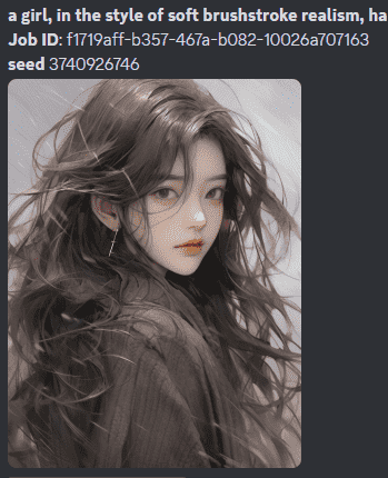 重点来了,我们需要选择图片进行高清放大,然后用添加反应:envelope(信封),在midjourney_bot和你的私聊窗口拿到:seed : 3740926746, 后面对提示词的修改,一定都要加上这个参数,保证小姐姐模样基本不变!