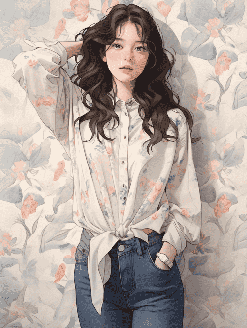 retro style, attractive Asian girl(人的描述), fashion white shirt and blue jeans(衣服的描述), high detail, half-length portrait(半身人物像), vintage wallpaper background(复古壁纸背景-替换了报纸墙面背景). front view, neutral colors, in the style of soft brushstroke realism, hallyu, 32k uhd, mashup of styles, wavy –ar 3:4 –niji 5 –seed 3740926746