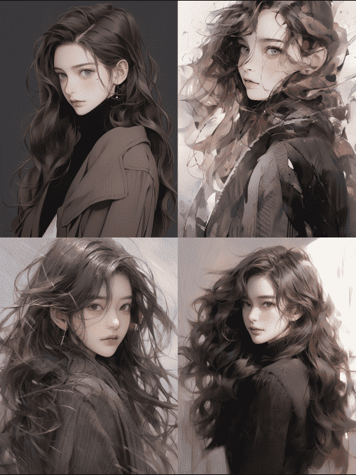 上面的左下图,我觉得效果不错,MJ prompt 如下:a girl, in the style of soft brushstroke realism, hallyu, dark silver and dark beige, 32k uhd, mashup of styles, i can’t believe how beautiful this is, wavy –ar 3:4 –niji 5
