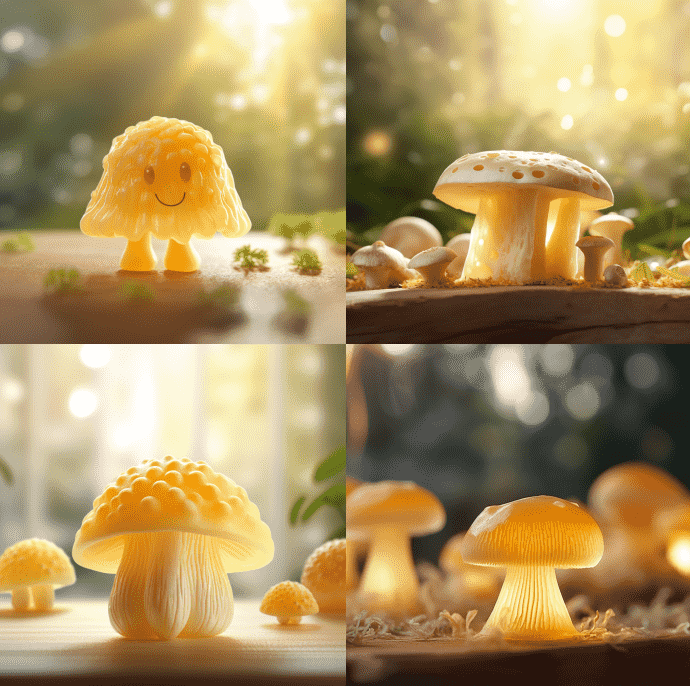 首先是蘑菇奶酪,这是两种常见食品的创新结合,Midjourney的创意仿佛把我们带入了一个可爱的童话世界。