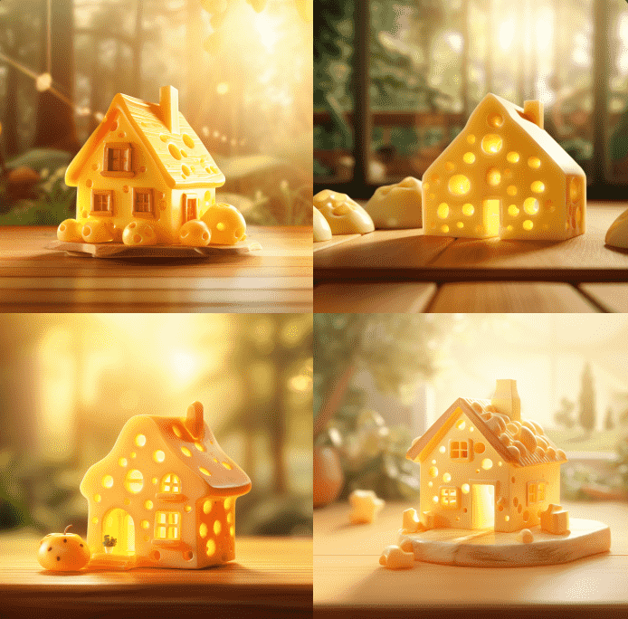 在这个童话奶酪世界里,自然少不了可爱的奶酪房子。只需简单改变一下关键词,就能创造出一组奶酪小屋的创意图片。