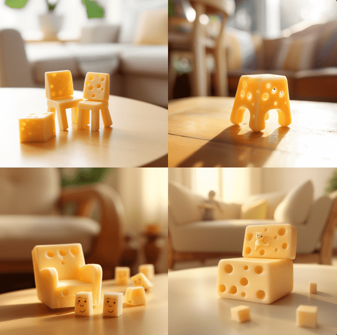 有了奶酪房子,我们自然会想到将奶酪与家具结合。Midjourney延续了前面的风格,创造出了许多可爱又可口的“奶酪家具”。