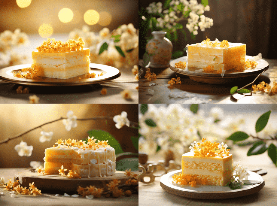 次尝试加入光影效果的图片非常成功,于是我们进行了更多的尝试。在设计桂花糕时,我们加入了落日光作为关键词。