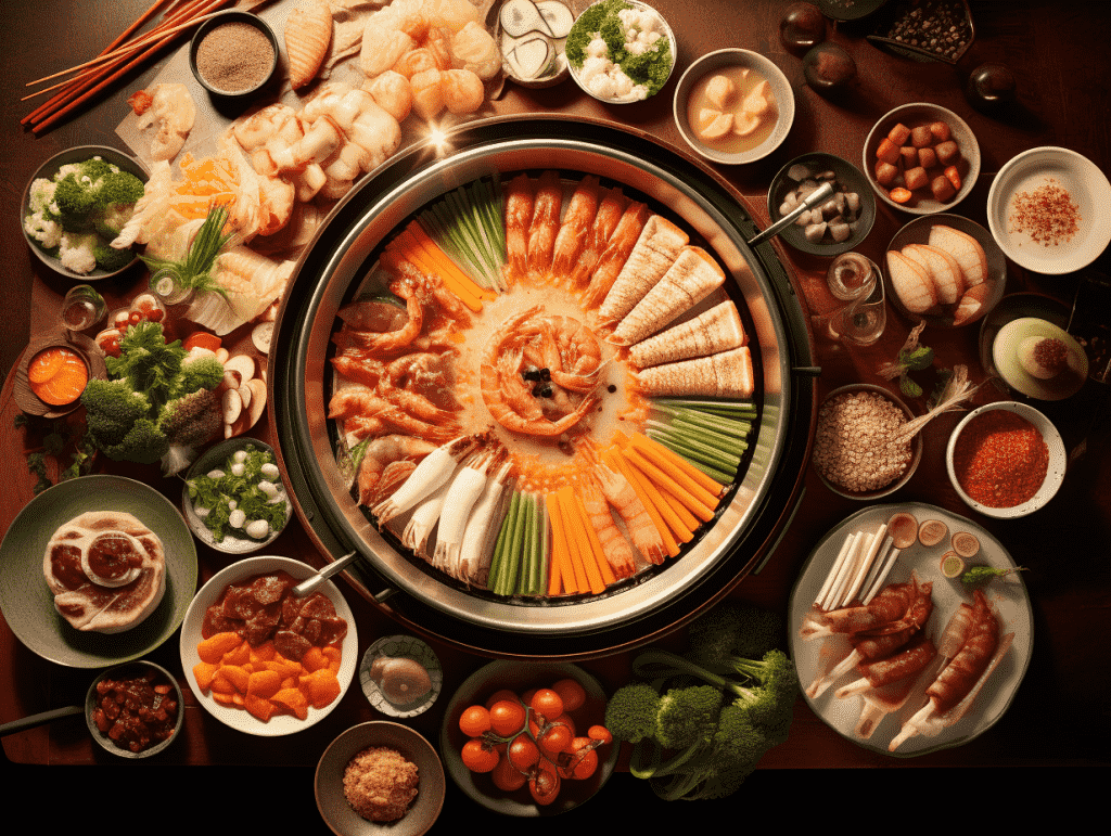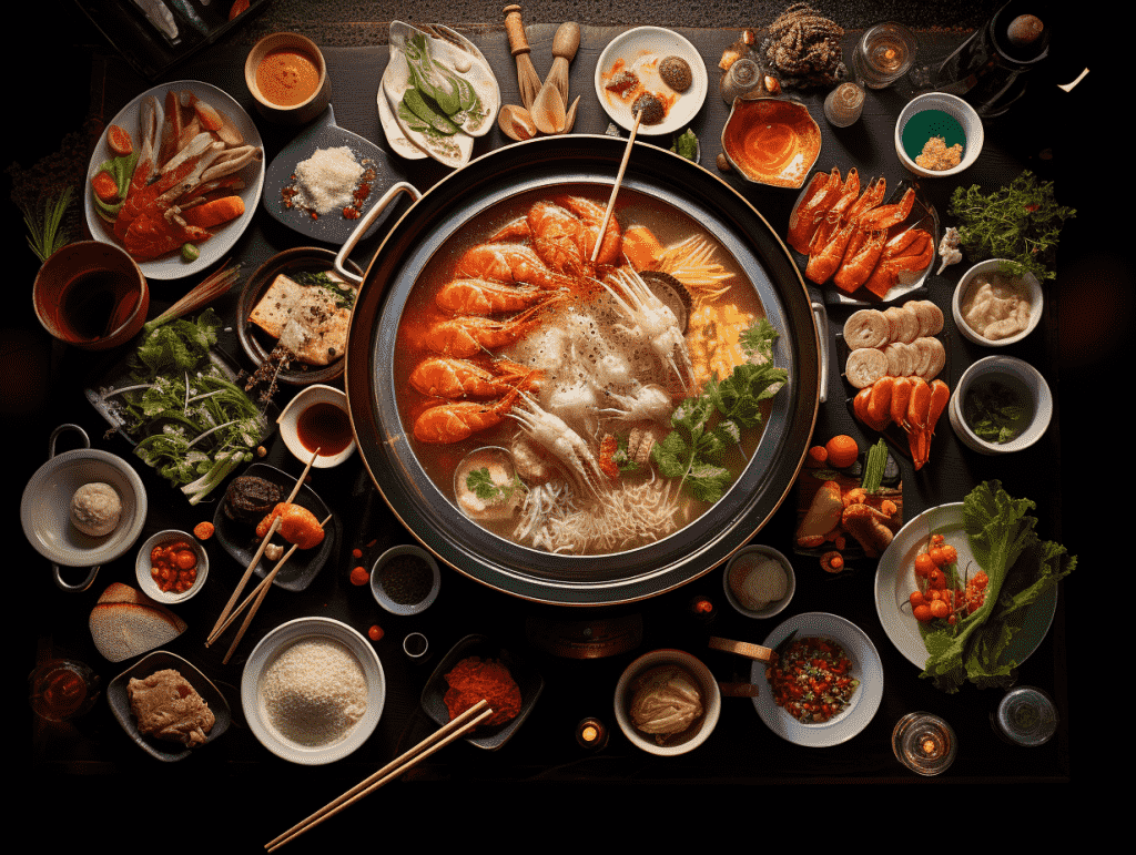 咒语: Food photography,Hotpot, boiling soup(主体) ,variety of raw ingredients, seafood, meat slices, vegetables, tofu, dipping sauce, chopsticks, traditional Chinese tableware,(修饰背景) indoor, dining table, warm lighting(打光), overhead shot(视角), 8k, Best quality, photorealistic(辅助词修饰词) –ar 4:3 –v 5.2(后缀)
