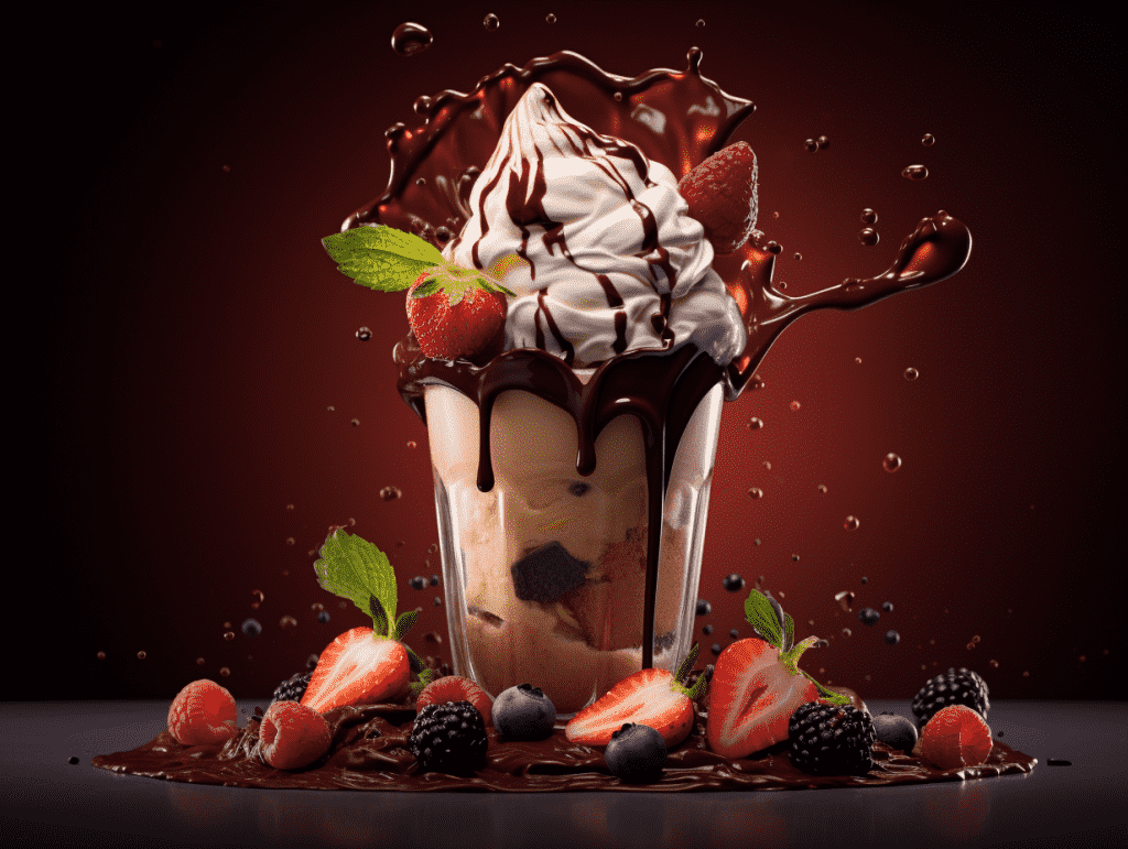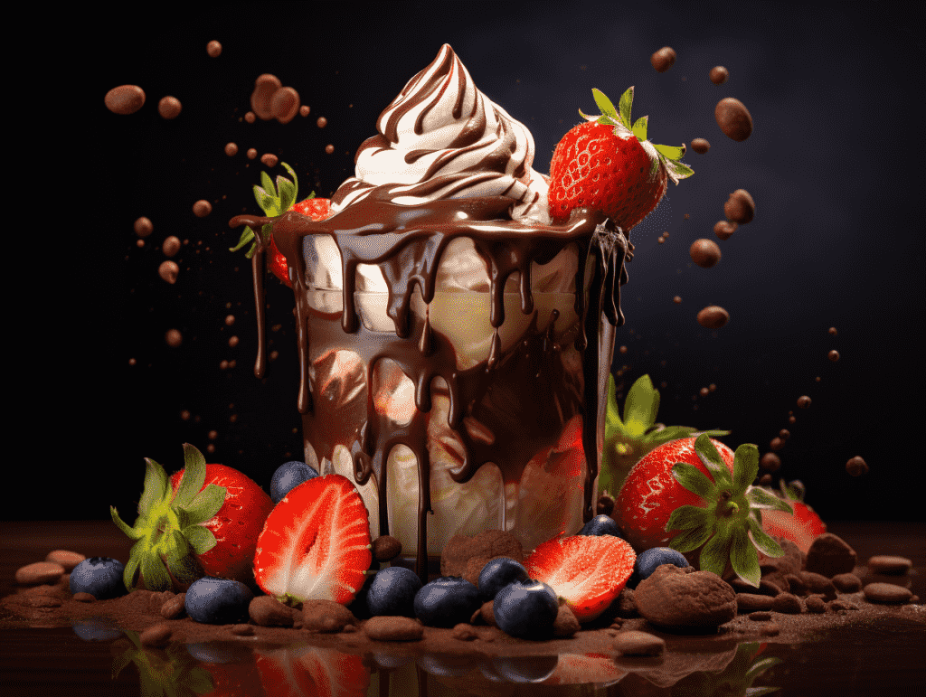 咒语:Food photography, Chocolate sauce dripping on a lile of smoothies, whipped cream and fruit, whipped cream and fruit, stadio lighting, front shot , 8k, Best quality, photorealistic. –ar 4:3 –v 5.2