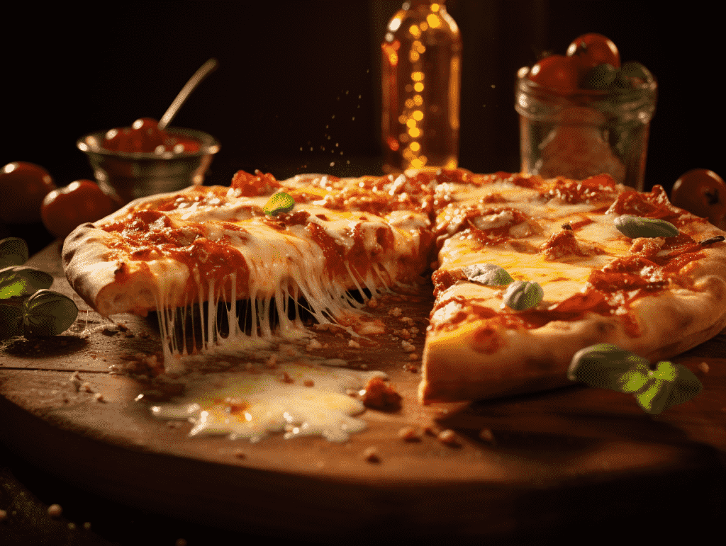 咒语:Food photography, peperroni cheese pizza, cheese pull of a slice, marco shot, focus on the cheese and vibrant toppings, warm lighting, 8k, Best quality, photorealistic. –ar 4:3 –v 5.2