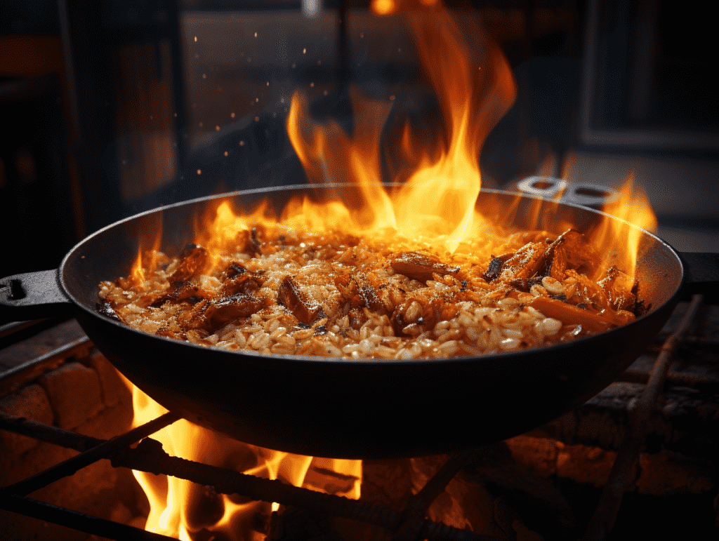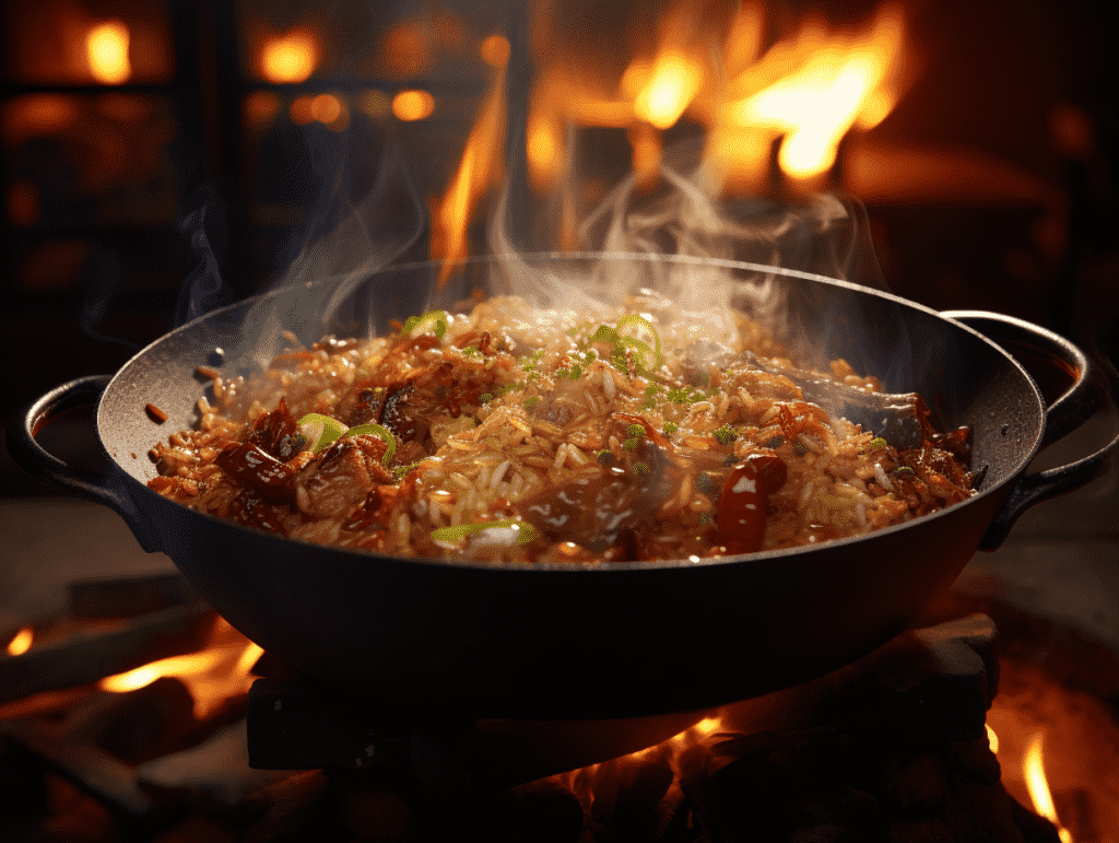 咒语:Food Photgraphy, grilled Fried Rice stew on the pot rack, with flames and sparks, the fire is in the pot, warming light, eye level shot, 8k, Best quality, photorealistic. –ar 4:3 –v 5.2