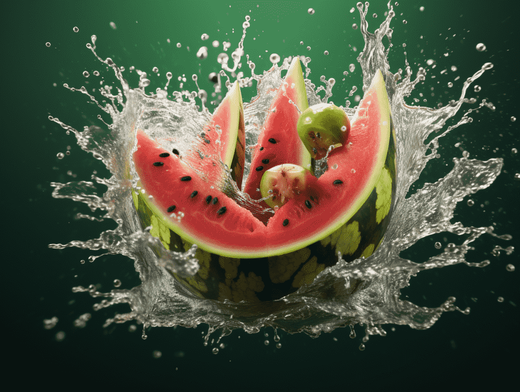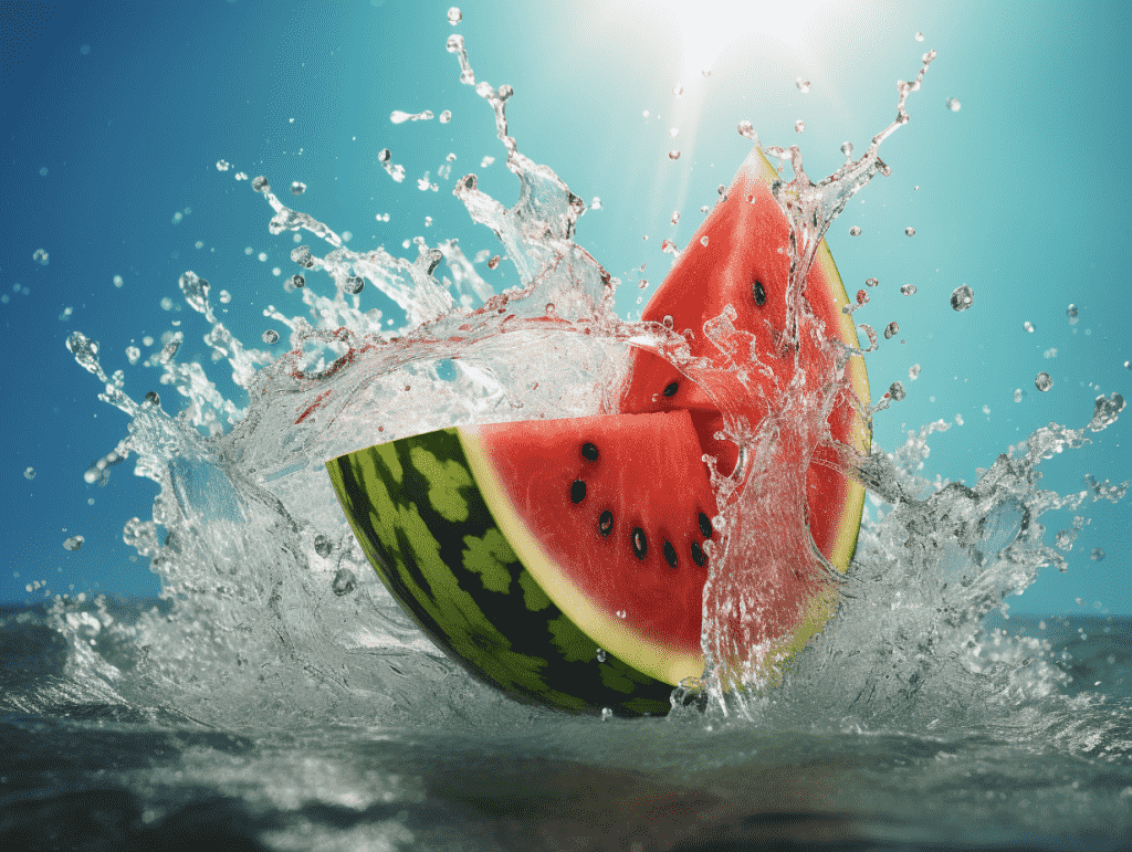咒语:Commercial Photography, a watermelon dropping, water splashing around, tropical background, stadio lighting, low angle shot, 8k, Best quality, photorealistic. –ar 4:3 –v 5.2