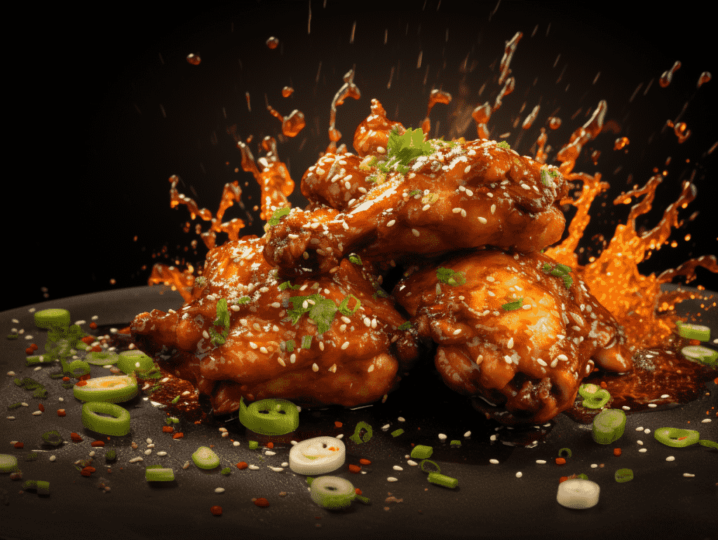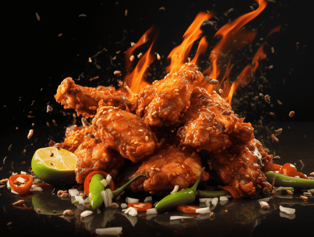 咒语: Food photography, powerful explosion of spicy chicken, black plain background,studio lighting, eye level shoot, 8k, Best quality, photorealistic –ar 4:3 –v 5.2