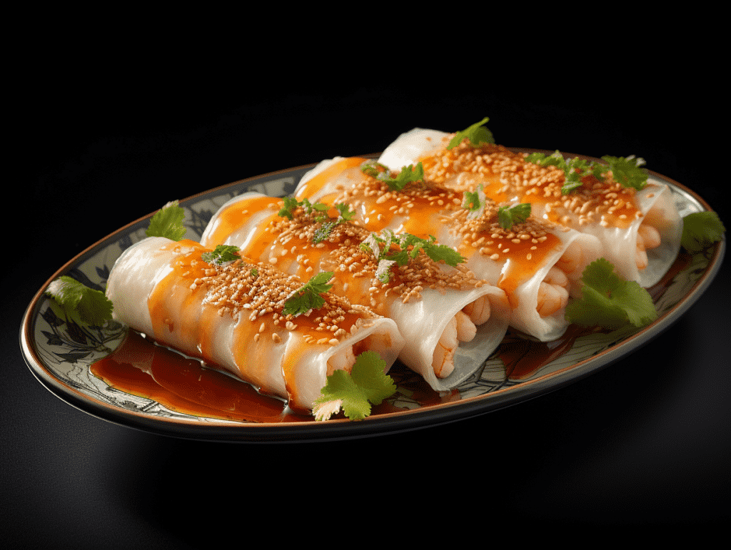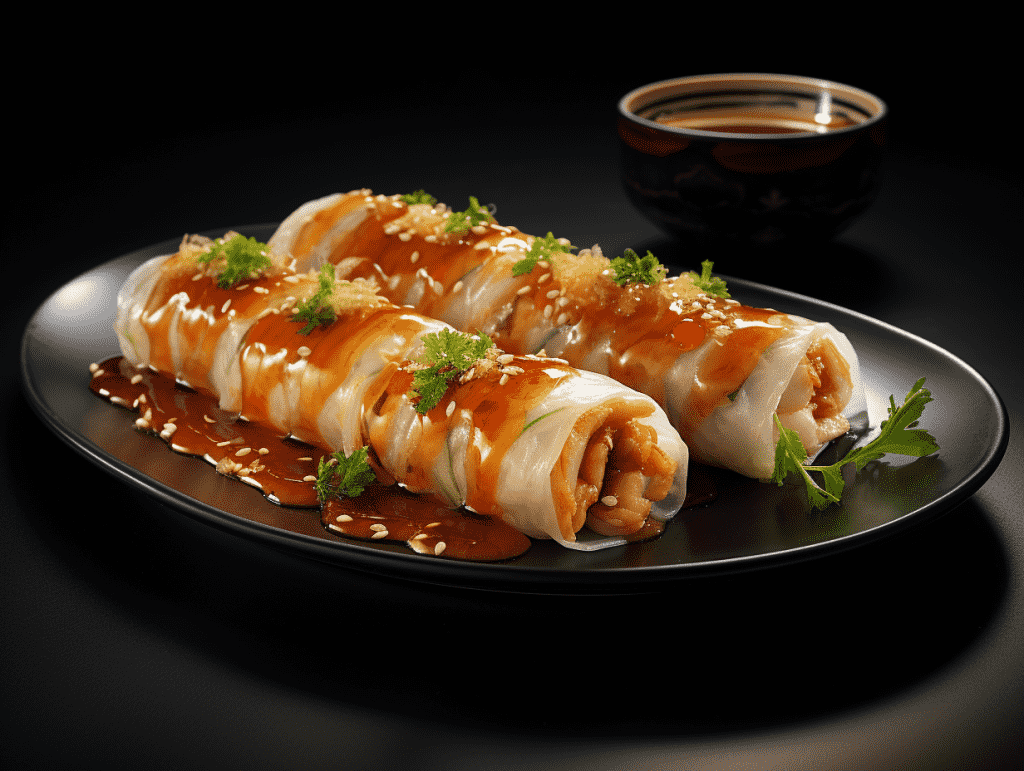 咒语: Food photography, Guangdong rice roll, steamed, filled with shrimp, beef or vegetables, soy sauce, sesame seeds, traditional Chinese porcelain plate, indoor,warm lighting, eye level view, 8k, Best quality, photorealistic. –ar 4:3 –v 5.2