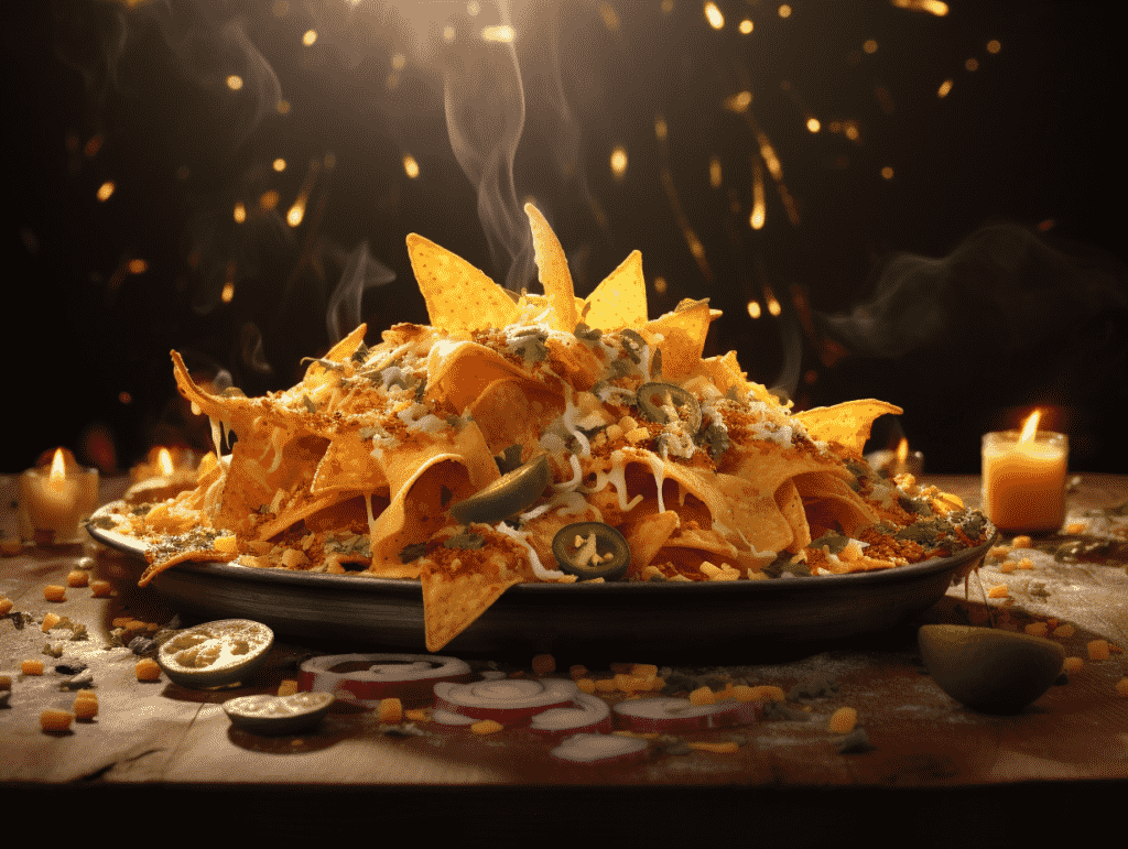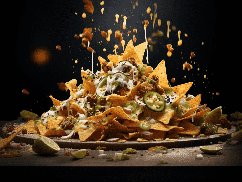 咒语:Food Photography, apile of nachos hitting on the table, with cheese, tomoto, onion and lime, stadio lighting, front shoot, 8k, Best quality, photorealistic. –ar 4:3 –v 5.2