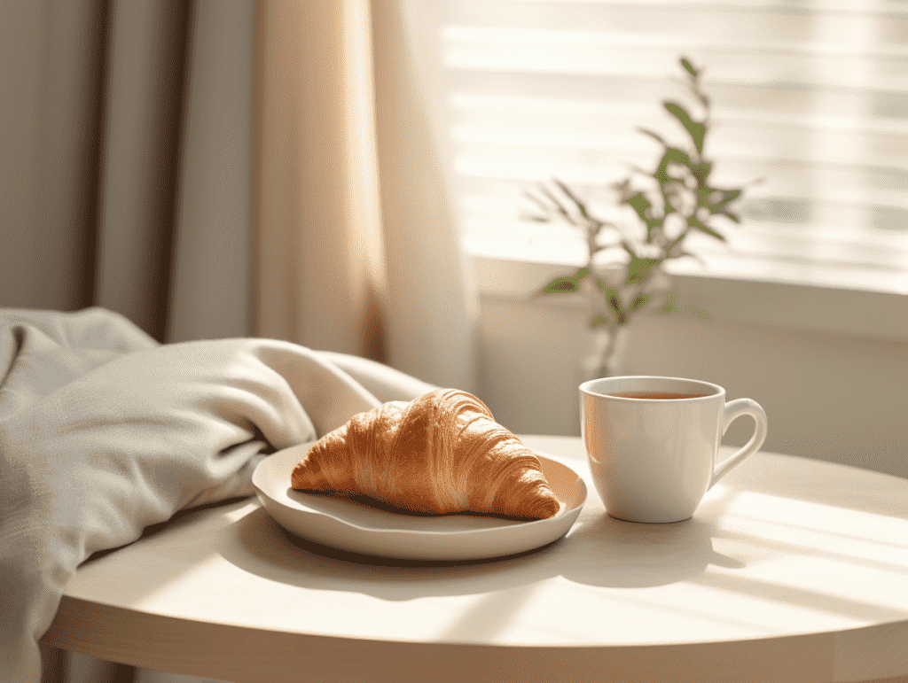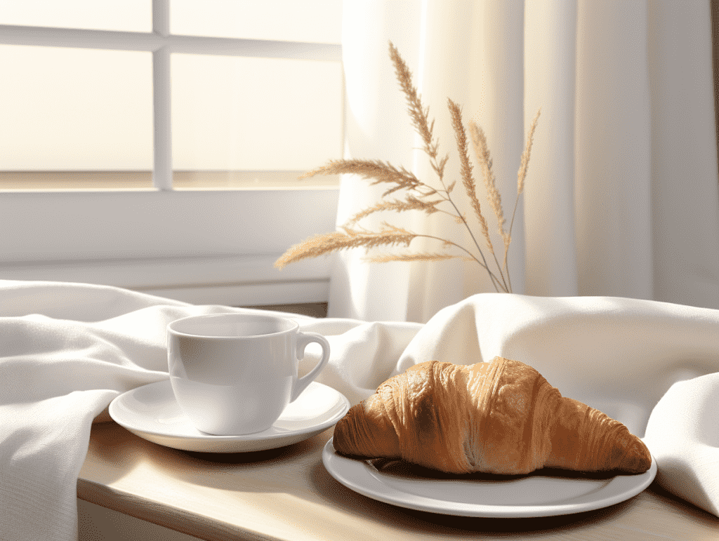 咒语:A croissant and a cup of coffee, warm enviornment, in a minimalist style living room, beige and white, sereneand calm, monochrome scheme, light-filled landscape, sunlight, eye level shoot, 8k, Best quality, photorealistic. –ar 4:3 –v 5.2