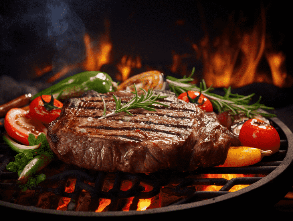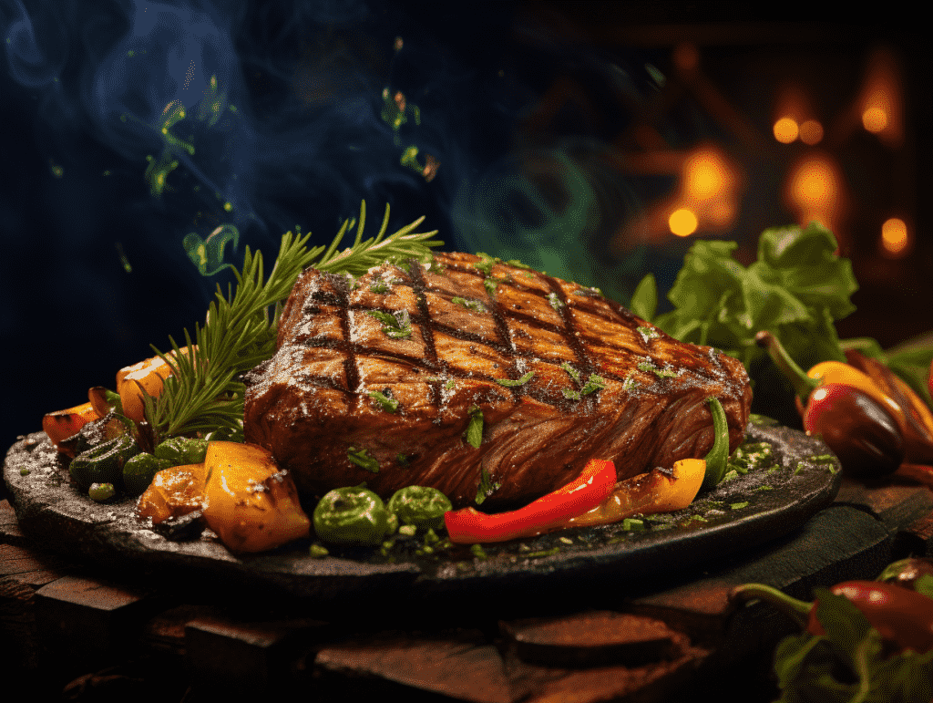 咒语:Commercial Photography, sizzling steak, with grill marks, adorned with fresh herbs and colorful vegetables, tropical background, eye level shoot, 8k, Best quality, photorealistic. –ar 4:3 –v 5.2