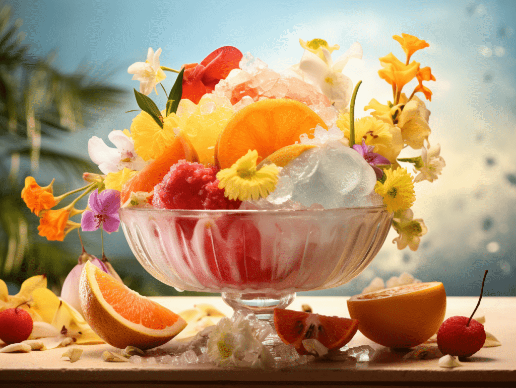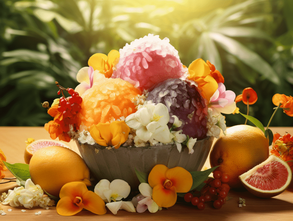咒语:Commercial photograph, a tropical fruit sorbet, center composition, surrouded by edible flowers and tropical fruits, beautiful sunlight,8k, Best quality, photorealistic. –ar 4:3 –v 5.2
