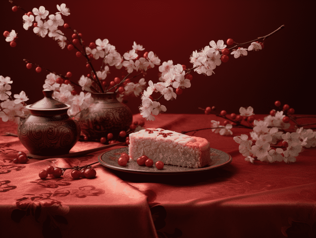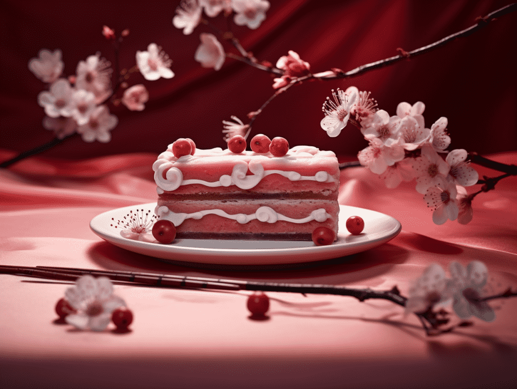 咒语:Commerical photography, Japanese pastries, sakura pastry shape, sakura decoration, symmetrical compostion, high end silk red table cloth with pattern, studio light, tropical background, eye level shoot, 8k, Best quality, photorealistic. –ar 4:3 –v 5.2