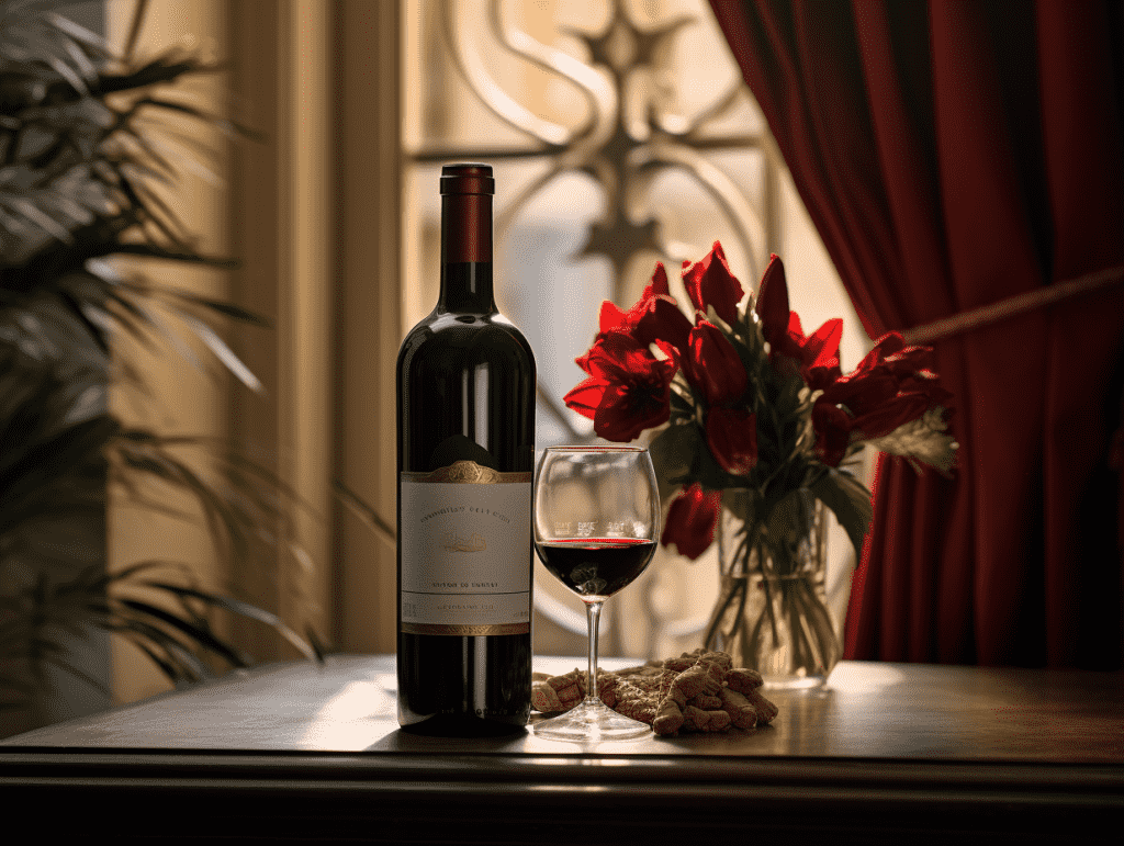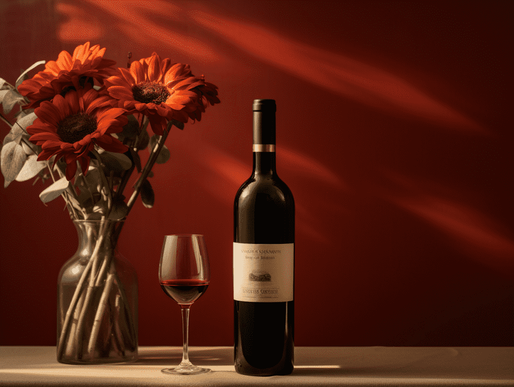 咒语:Commerical photography, a bottle of red wine, luxurious and high end, flowers, red wall, beautiful lighting and shadow from the window,eye level shoot, 8k, Best quality, photorealistic. –ar 4:3 –v 5.2