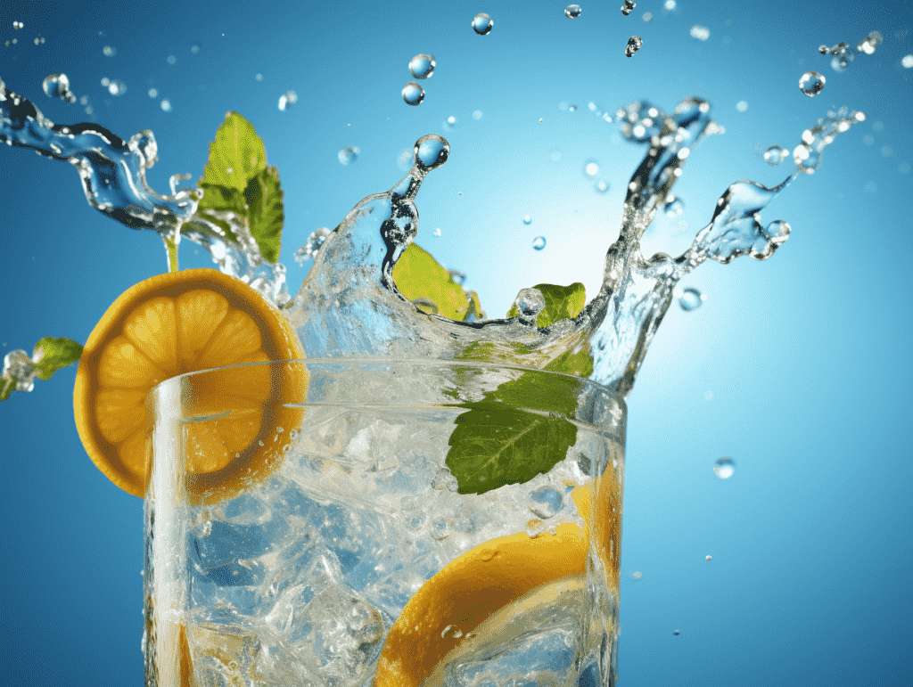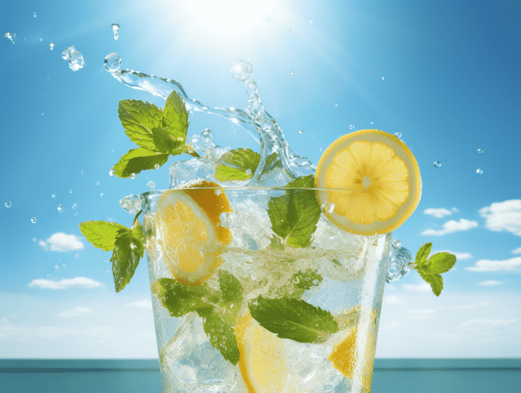 咒语:Commerical photography, a glass of lemonade, surrounded by lemon andmint, low angle, blue sky background,water droplets and splashing, sunlight,close-up, 8k, Best quality, photorealistic. –ar 4:3 –v 5.2