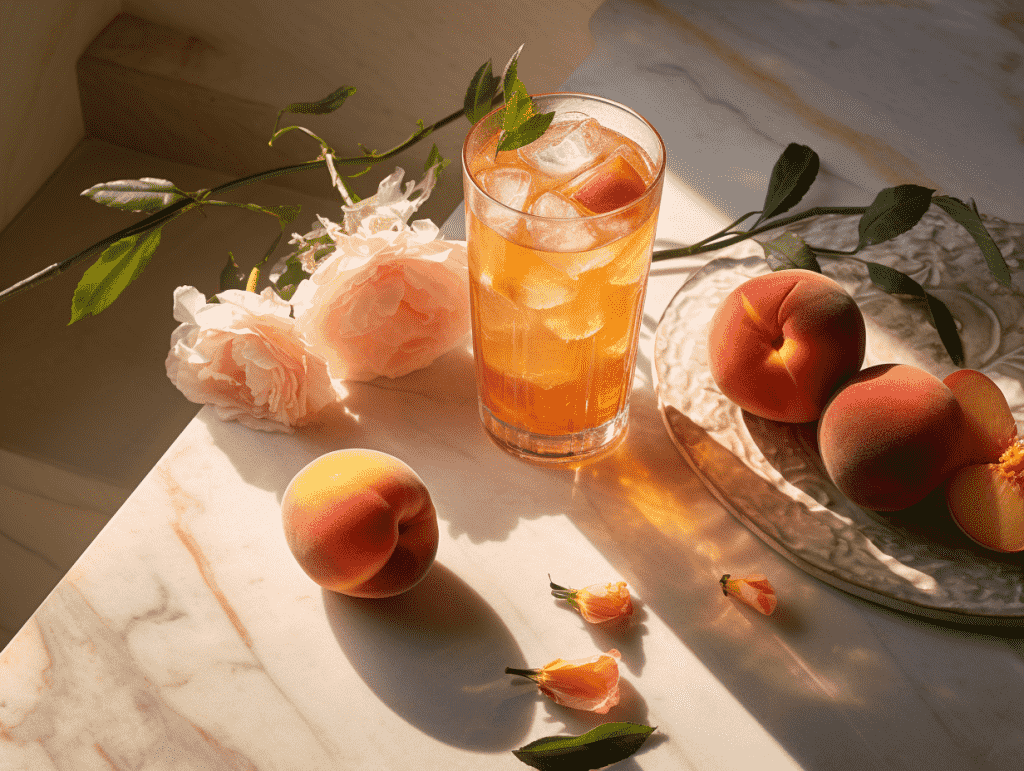咒语:Food photography, French romance, a glassof peach soda, on a marble stonetable, with peaches and flowers beside, high angle, beautiful sunlight and shadow, 8k, Best quality, photorealistic. –ar 4:3 –v 5.2