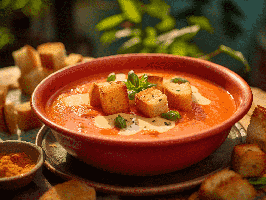 Food photography, a creamy tomato soup with a swirl of fresh cream, topped with crispy croutons and a sprinkle of basil, warm lighting, tropical background, high angle, eye level shoot, 8k, Best quality, photorealistic. –ar 4:3 –v 5.2
