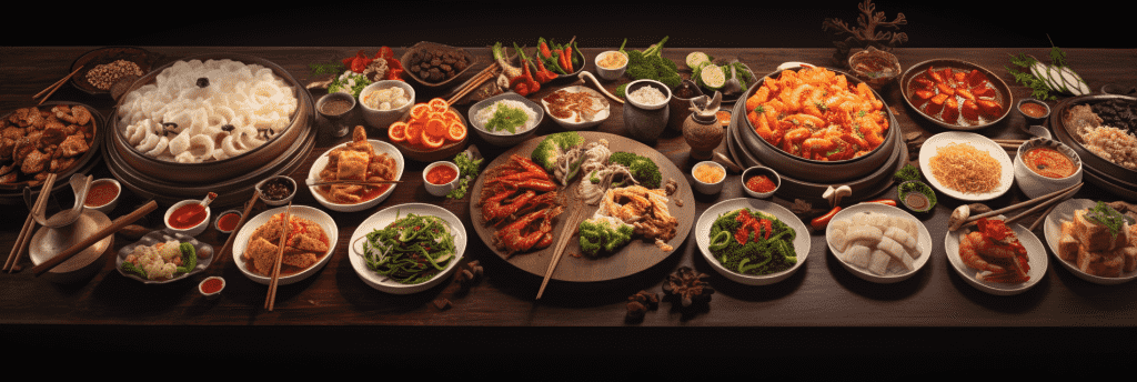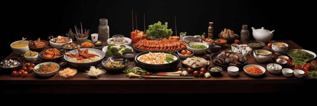 咒语:Knolling of Chinese cuisine, professional food photography, on a longtable, realistic, depth of field, 8k, Best quality, photorealistic. –ar 3:1 –v 5.2