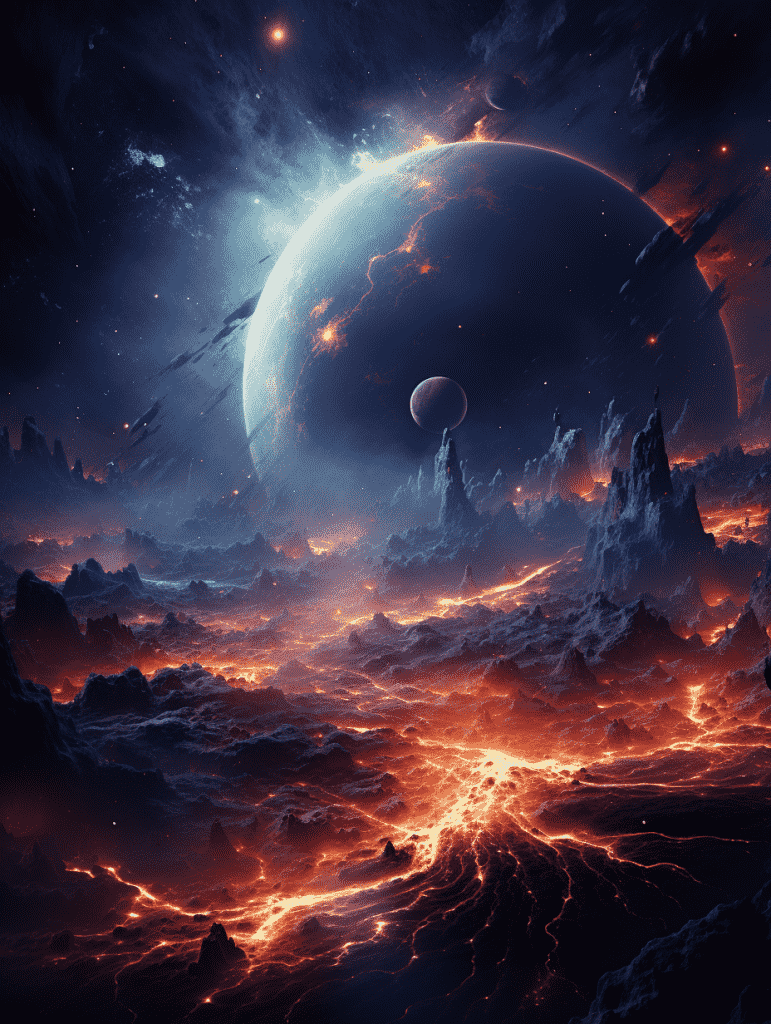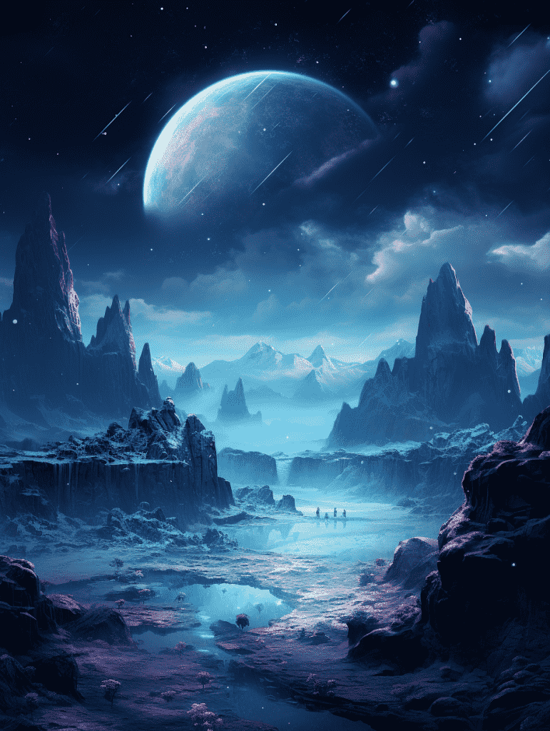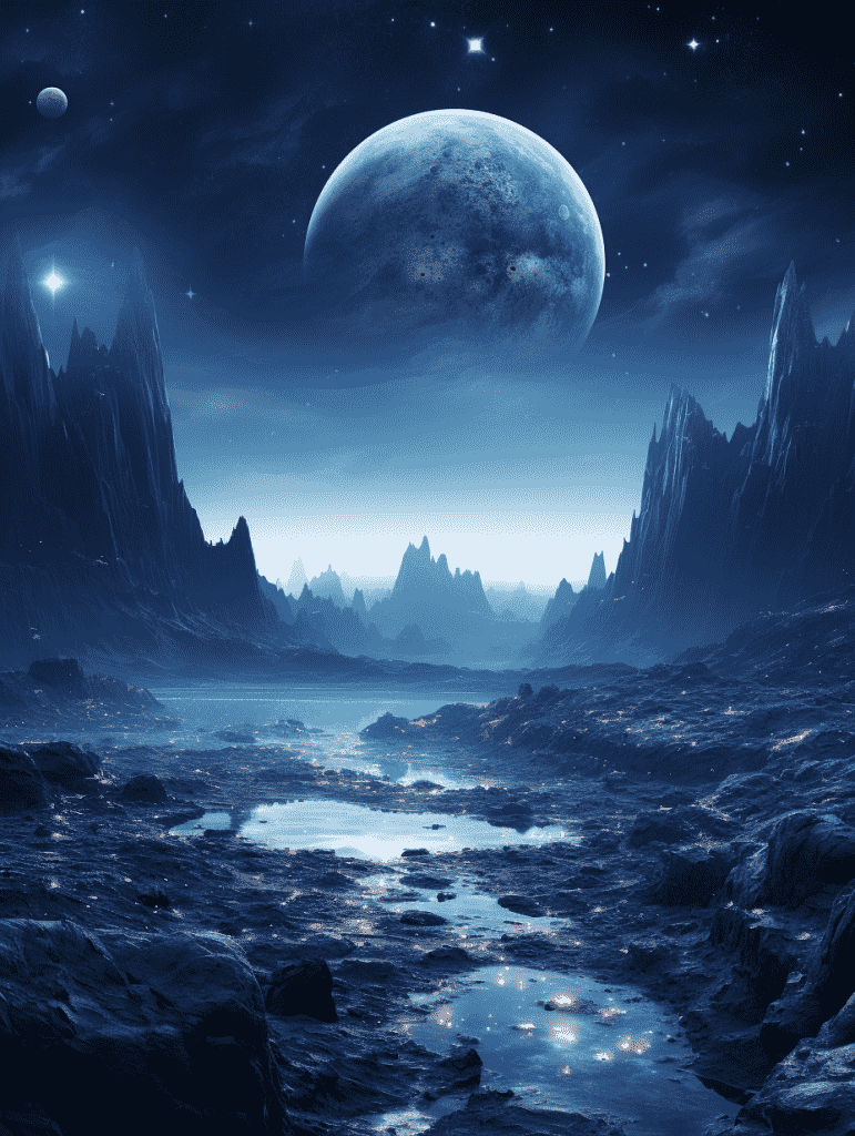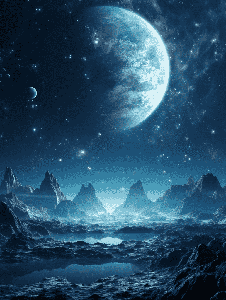 EN:Space art wallpapers, dark silver and sky blue, planets, galaxies, cinematic style, super detailed details, stunning, super high quality, –q 5 –s 250 –ar 3:4 –v 5.2