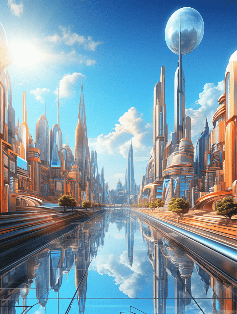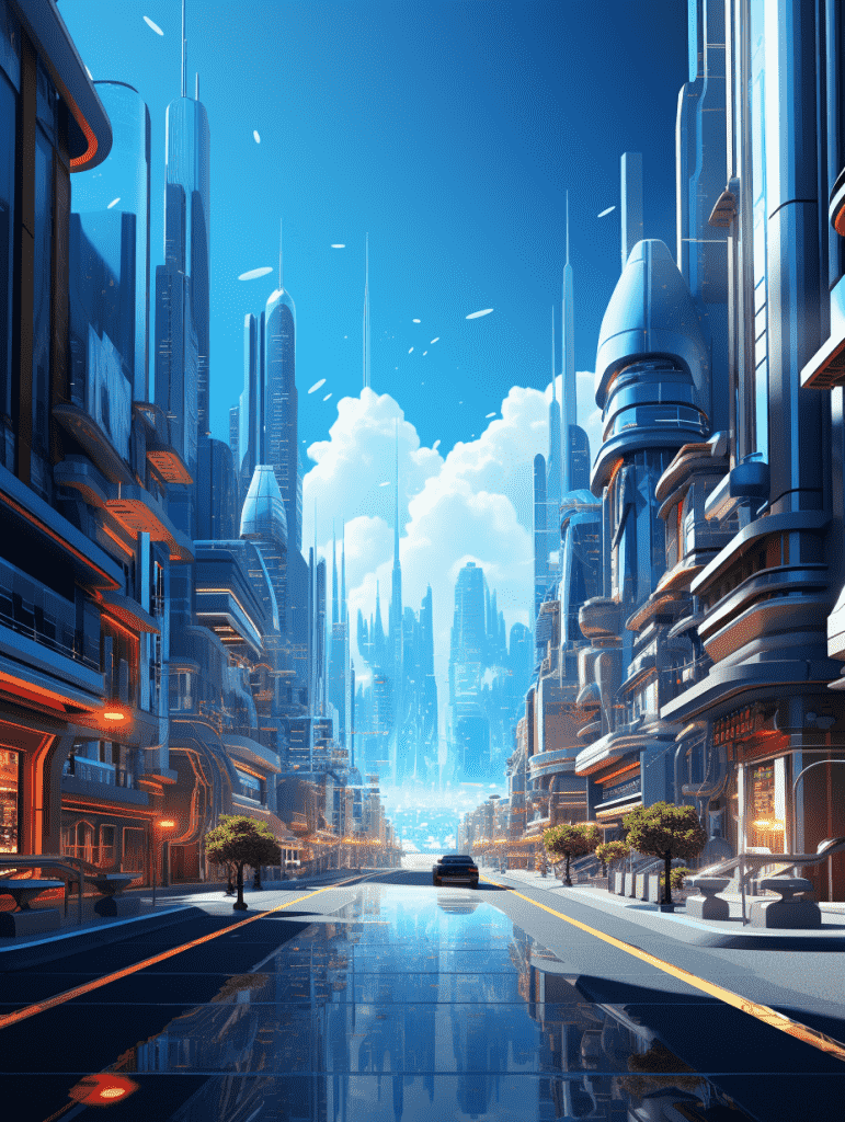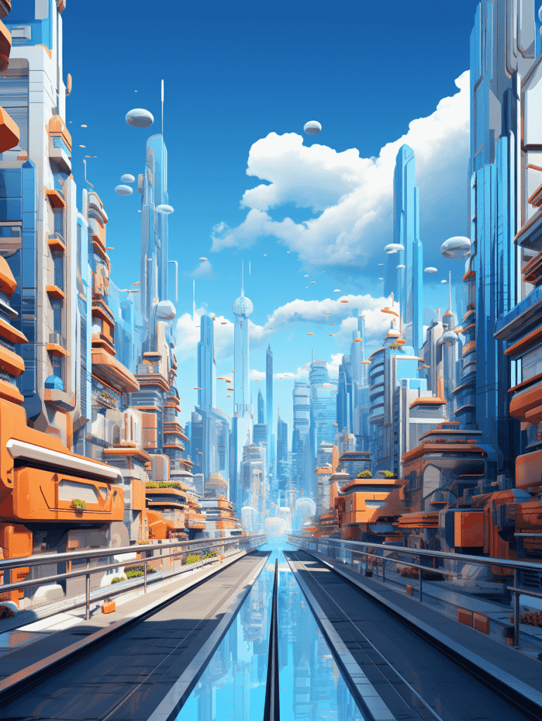 EN:A city scene animated 3D scene, bright colors gradual change, colorful city with futuristic architecture, super detailed rendering, vibrant style, 2.5D, graphic design, sky blue with light orange, best quality, –q 5 –s 250 –ar 3:4 –v 5.2
