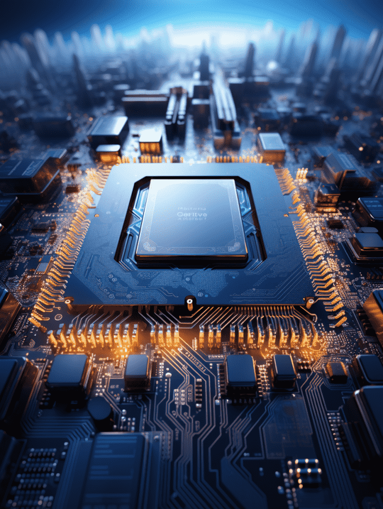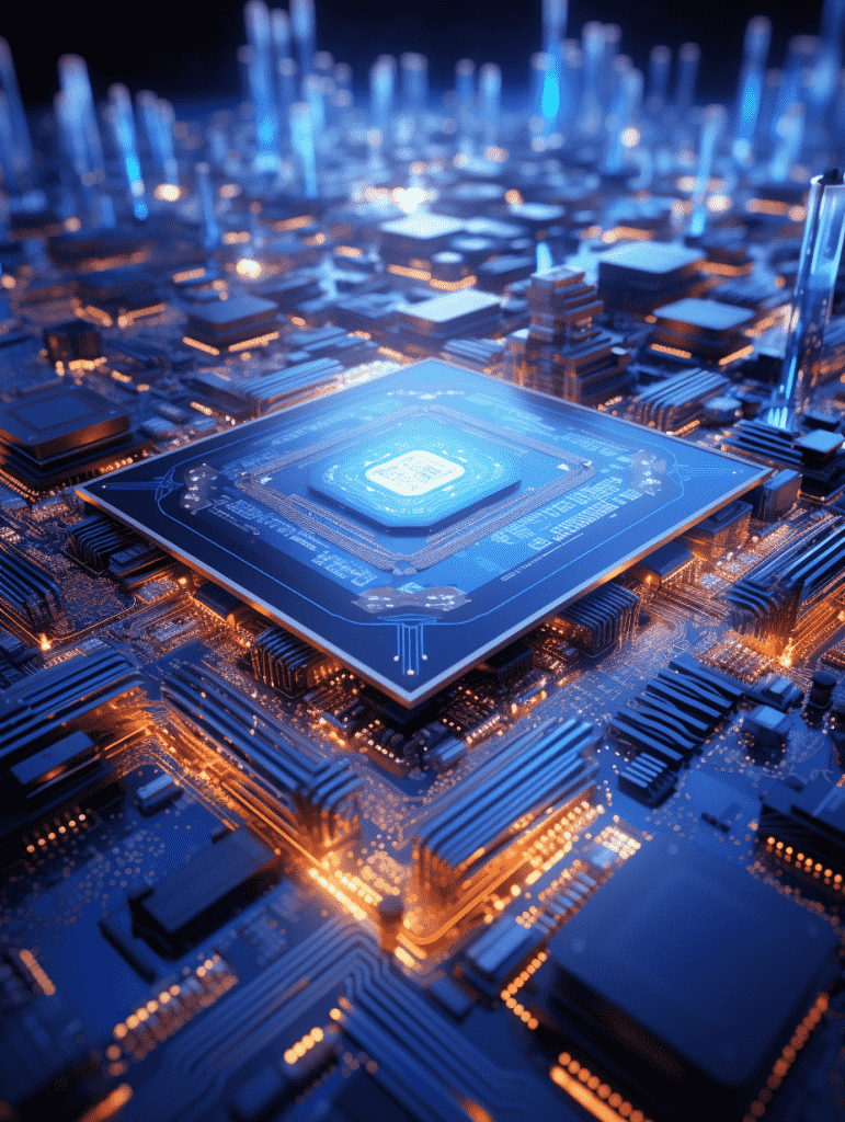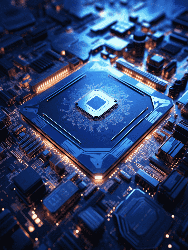 EN:An electronic chip image, bright blue light, CPU chip, Unreal Engine, highest quality, best detail, –q 5 –s 250 –ar 3:4 –v 5.2