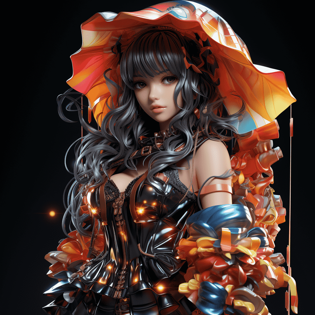 CN:一个3D卡通中国少女,洛丽塔,18岁,少女,七彩,缤纷,魔幻,3D,C4D,OC渲染,简约黑色高反光背景,黑色地面,黑色背景,全身照,全身镜头,面对镜头,