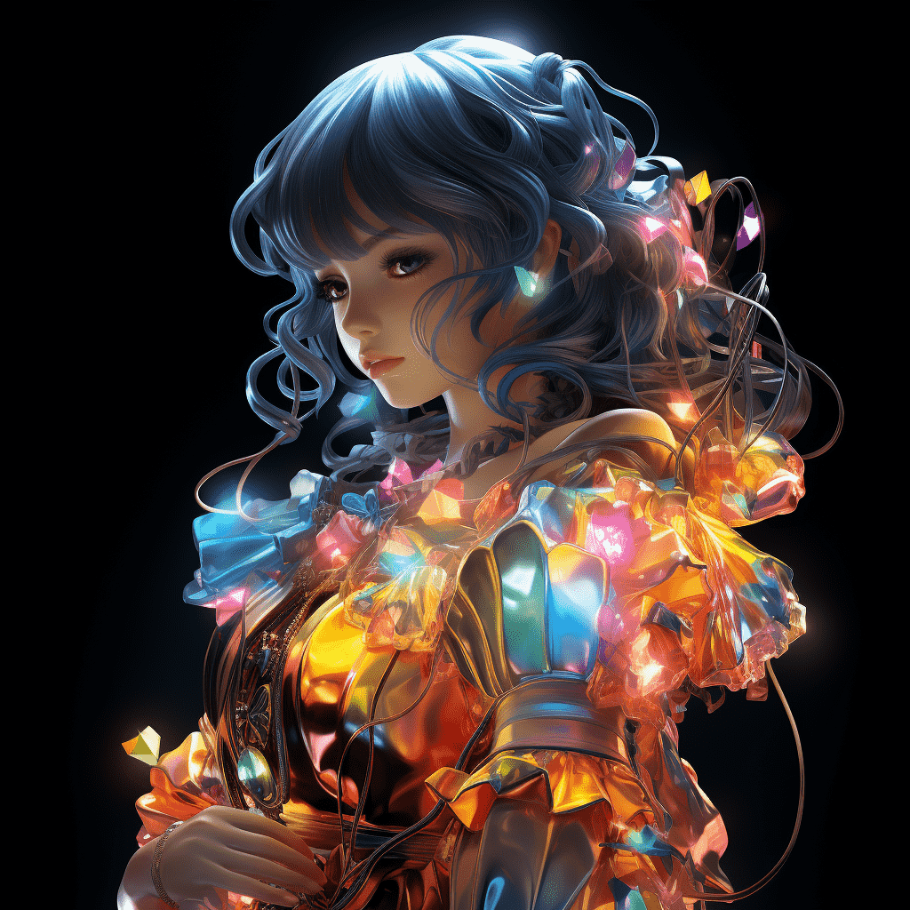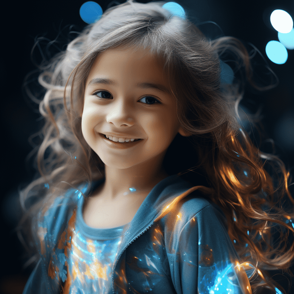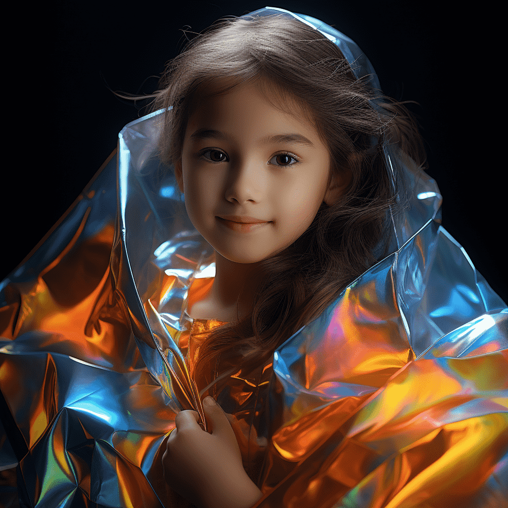 EN:Holographic 3D beautiful girl, beautiful girl, China, little girl, 6 years old, smiling, holographic, holographic color, futuristic sense, advanced sense, scientific sense, black highly reflective background cloth, best picture quality, best quality, 3D, 3Dmax, OC rendering, –q 5 –ar 3:4 –s 250 –v 5.2