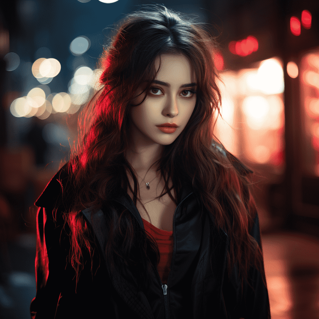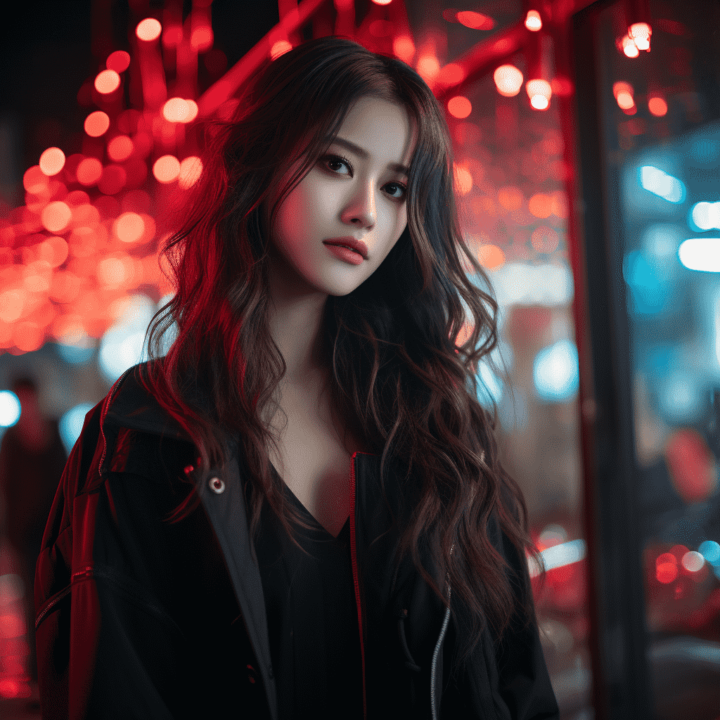 EN:A China girl, oval face, long hair, loose hair, long eyelashes, red mouth, wearing earrings, wearing black spy clothes, in the commercial street, 2.2D, thick coating, Cyberpunk, upper body, facing the camera, soft light, best quality, best picture quality, 8K, neon light, –q 5 –ar 9:16 –s 250 –v 5.2