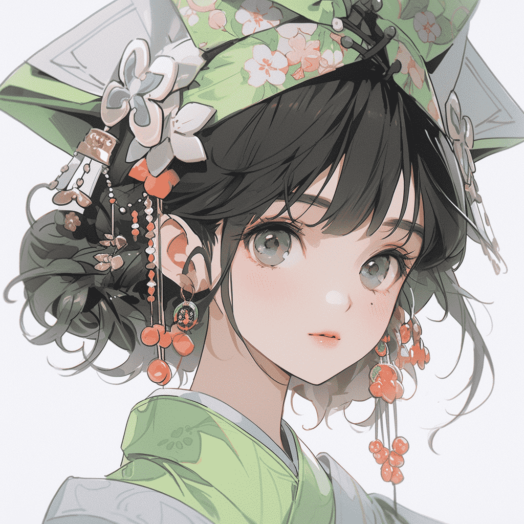 EN:A beautiful girl with a sketch, exquisite eye and lip makeup, melon seed face, exquisite earrings, exquisite headgear, wearing Hanfu, flat line depiction, minimalism, George Morandi, marker art, pink and green, simple gray background, –s 180 –ar 3:4 –niji 5
