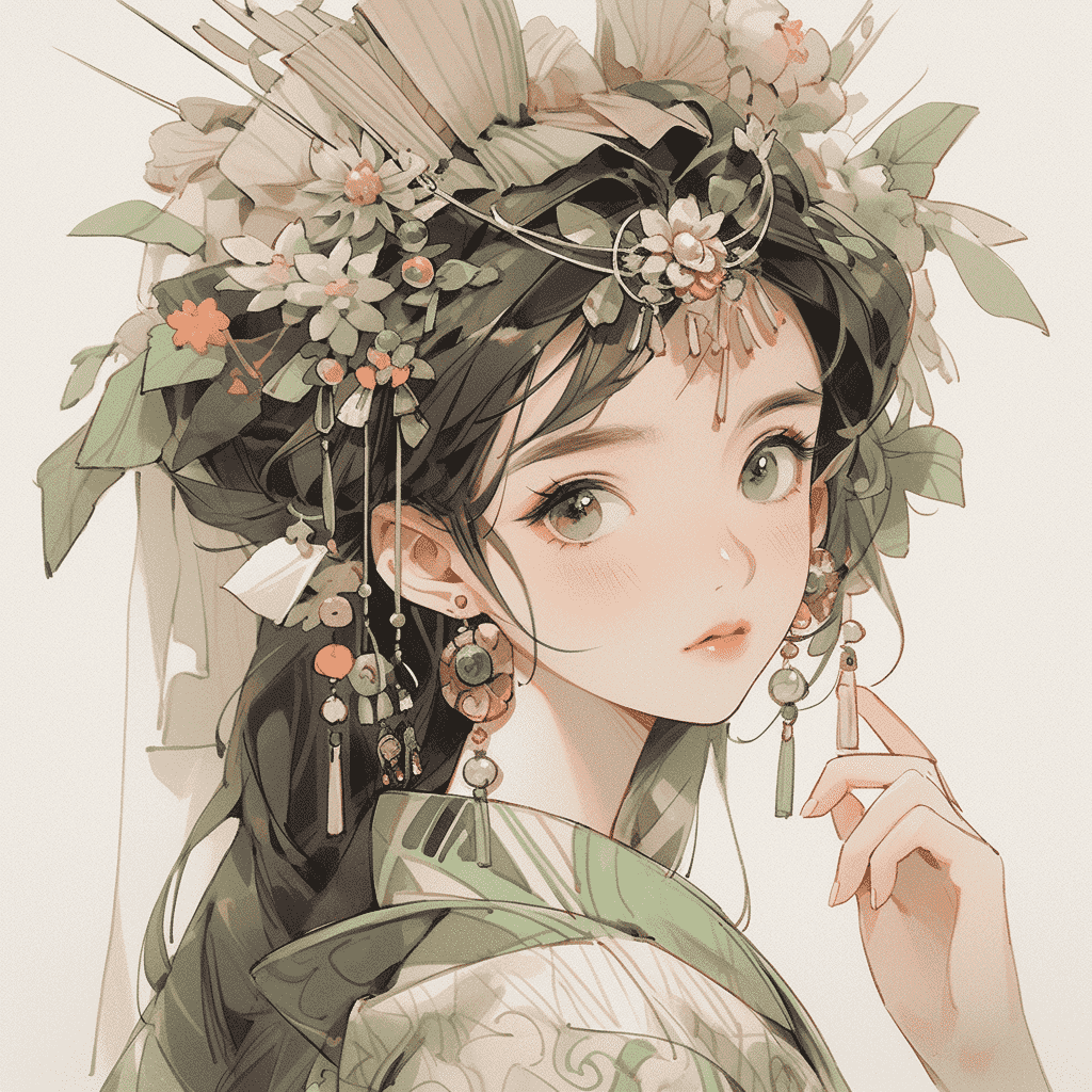 EN:Cartoon illustration, a very beautiful girl, wearing Chinese Hanfu, roses, Chinese style, Mrs. Becca Doodle, master masterpiece, character close-up, character illustration, Chinese traditionalism, beige and green, best quality, shiny shiny, shiny, –s 180 –ar 3:4 –niji 5