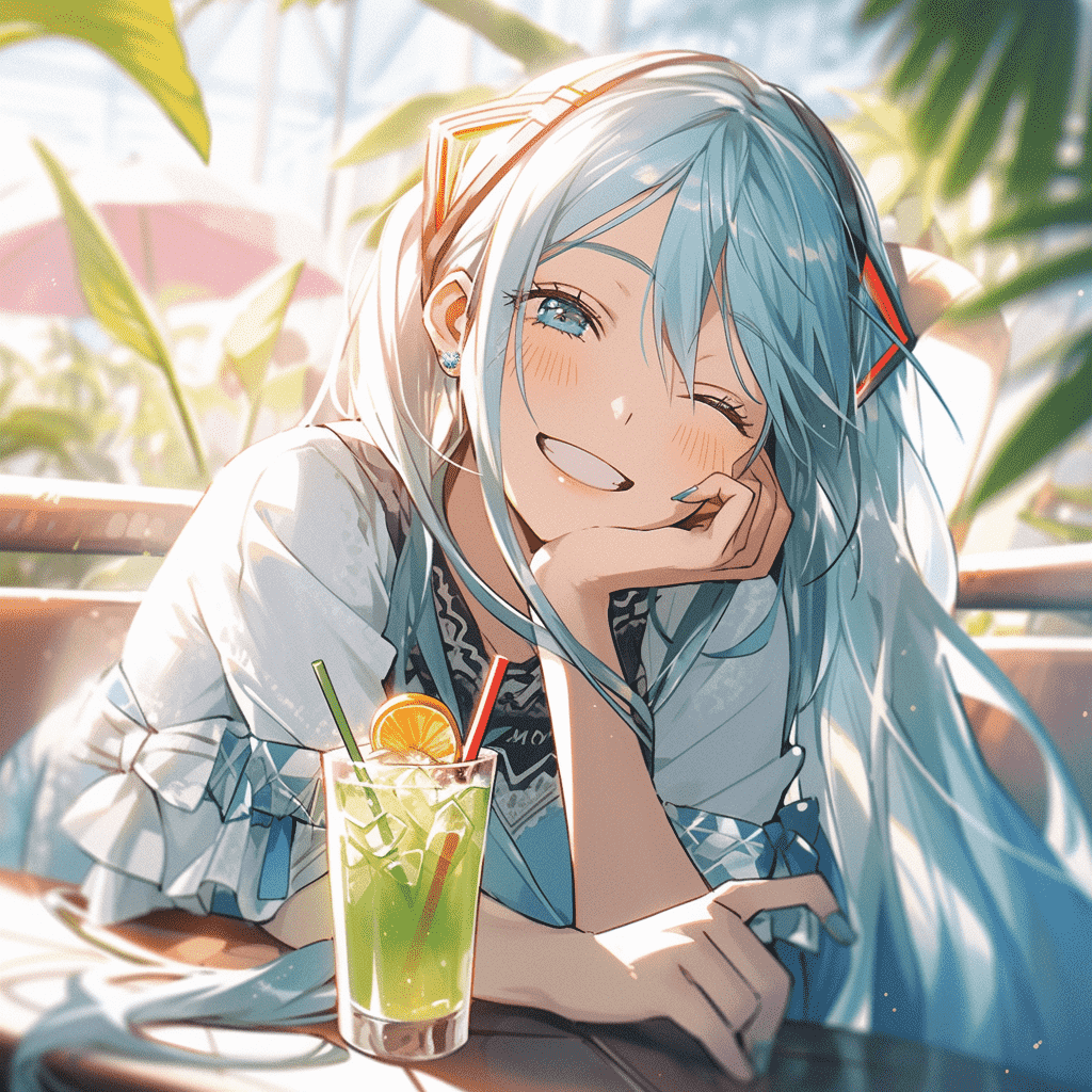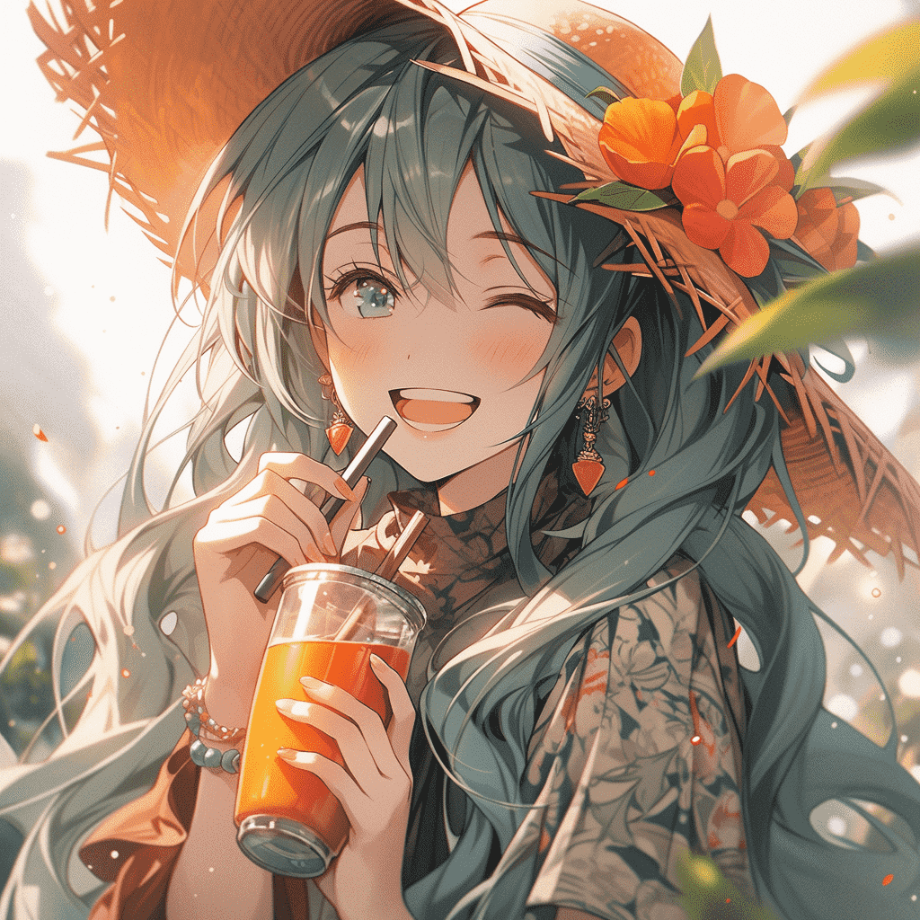 CN:动漫美少女,长发,开心大笑,非常漂亮,穿着夏装,喝着橙汁,青色和绿色,活泼,俏皮,动漫风格,闪亮有光泽,明暗对比,厚涂,UHD,最佳画质,最佳质量