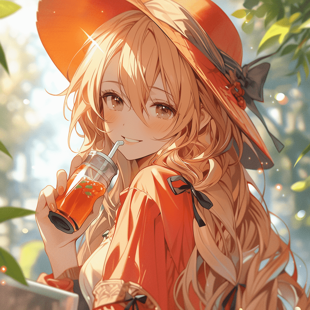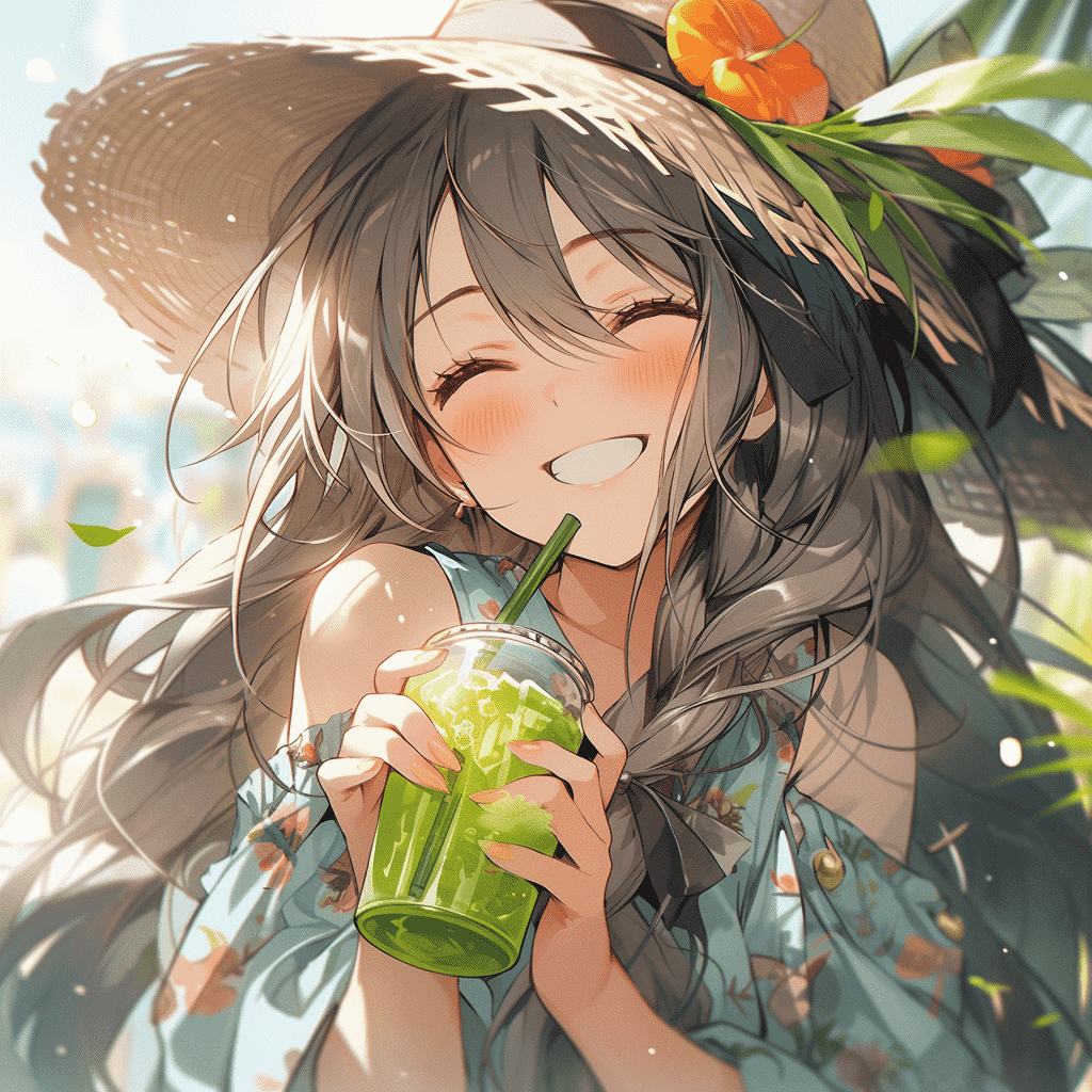 EN:Anime beautiful girl, long hair, happy laughter, very beautiful, wearing summer clothes, drinking orange juice, cyan and green, lively, playful, anime style, shiny and shiny, contrast between light and dark, thick coating, UHD, best picture quality, best quality, –s 250 –ar 3:4 –niji 5