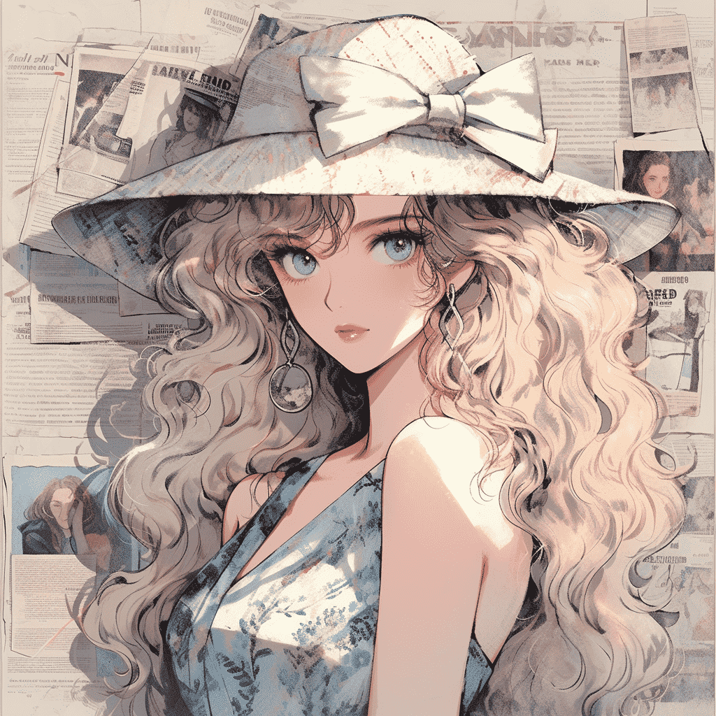 EN:Beautiful girl, long hair, perm, dress and hat, retro newspaper background, 1980′ s and 1980′ s, Hong Kong style, cartoon style, shiny and shiny, contrast between light and shade, thick coating, UHD, best picture quality, best quality, –s 250 –ar 3:4 –niji 5