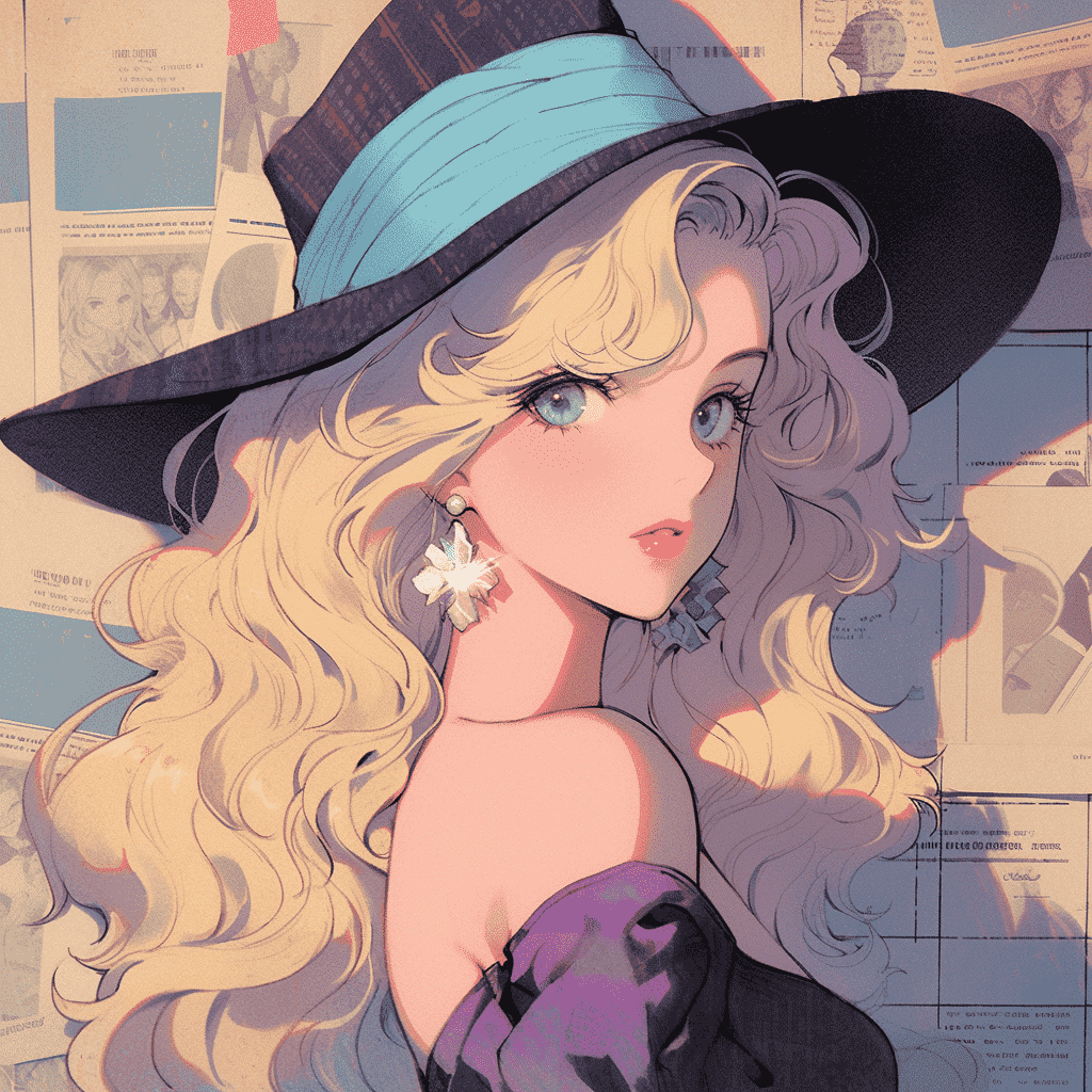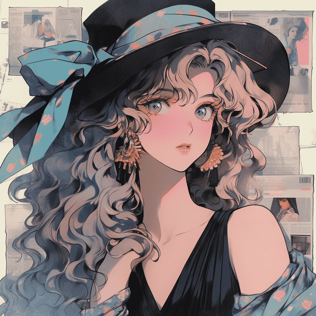 CN:美少女,长发,烫发,穿着礼服,戴帽子,复古报纸背景,1980,80年代,港风,香港风,动漫风格,闪亮有光泽,明暗对比,厚涂,UHD,最佳画质,最佳质量